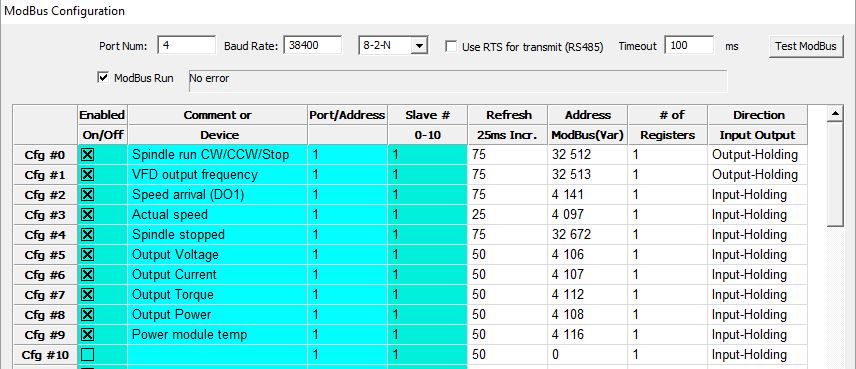 To control the RPM the frequency value must be sent with two decimals in integer format, so 24,000 RPM = 400Hz and the data to be sent will be 40000 to holding register address #32513. In my picture the spindle RPM is set to 16,300 and to get there Mach3 must multiply that with 0.6 and send 27166, corresponding to 271.66 Hz. The decimals are truncated, but that doesn't really matter, the RPM is accurate enough.
