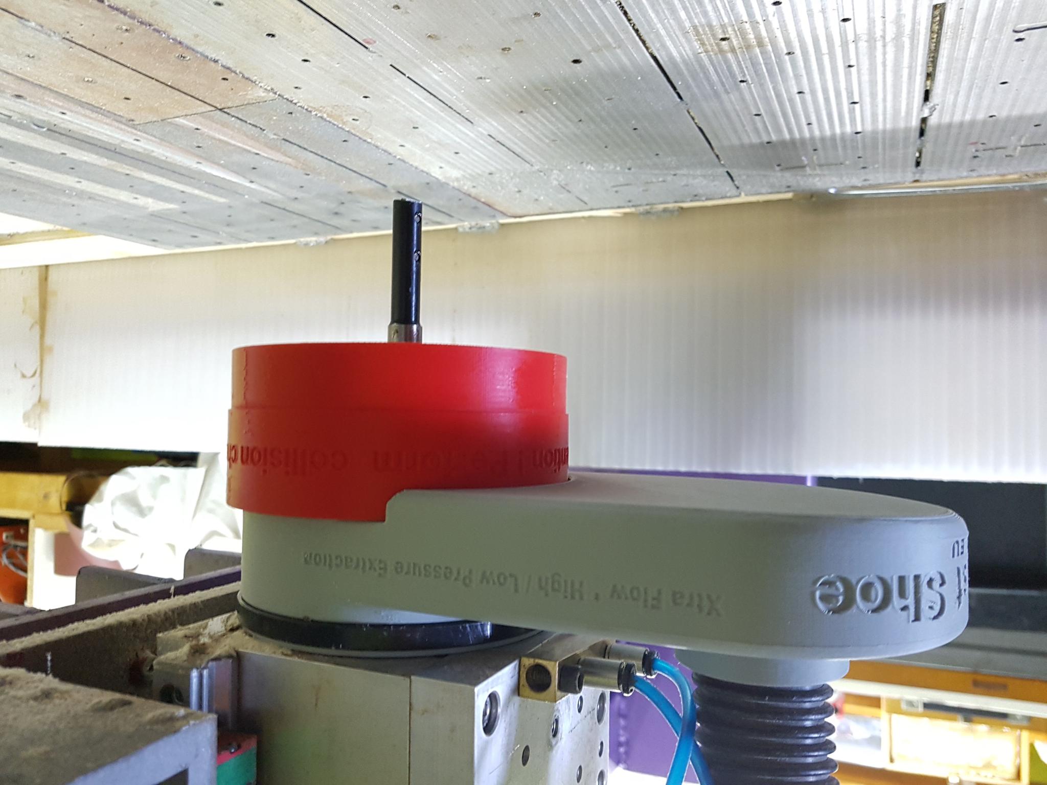 In short after about 10 prototypes and extensive testing i am happy with a model of a dust shoe that i use now on my machine. On pictures is seen for 100mm OD spindle and 40mm OD hose, but as i have designed it myself from 0, i can make and print any spindle hose combination you like. So its ideal for spindles to 100mm and to hoses up to 100mm.