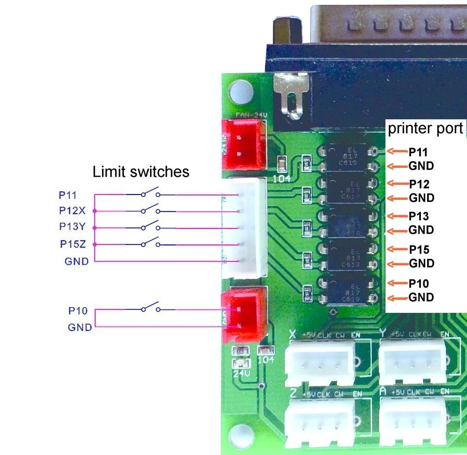 the breakout board does not have any pull up resistors to ensure a printer port input is at a valid logic high when the limit switch is open