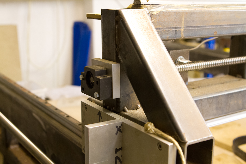 An unusual feature (not unique so I’m making no claims here but I don’t remember seeing one described at the time I started my design) is the welded steel gantry. People worry about gantry mass and how it might affect performance. When I did the sums, I reckoned that the rotational inertia of the ballscrews was at least as important, if not more so, than the inertia of the gantry when it came to acceleration/deceleration (which is what often matters most – inertia isn’t very relevant to speed) even with the steel gantry. With suitable bracing it could be pretty strong even though I was using my 3mm wall thickness box. This design also meant that I could run the ballscrews through the uprights at the ends of the gantry which solved a lot of design issues. More about all this later.