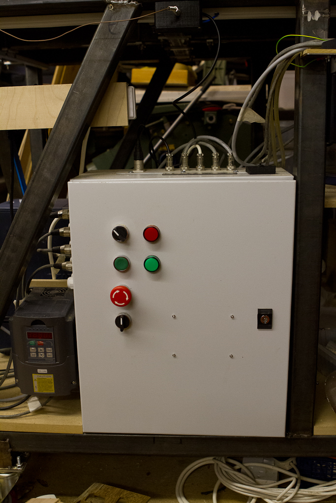 The control box uses EM806 drivers running from 68V linear PSU for X and Y, and a recycled M752 for Z – less critical than X and Y, and not needing the stall detection which (in my view) is absolutely necessary for a dual-motor axis such as mine. There is a CSMIO-IP/M motion controller, plus Pilz safety relay and the usual odds and ends. Limit switches are inductive, NPN NC, running off 24V.