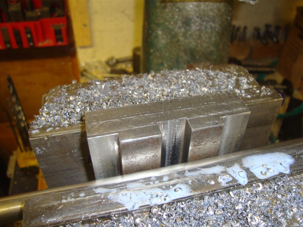 Not a chance of getting an RM1204 ballnut in the cross slide, let alone two, so I've mounted them behind. To do this I milled a block of steel to extend the saddle for the ballnuts' mount and drilled it: