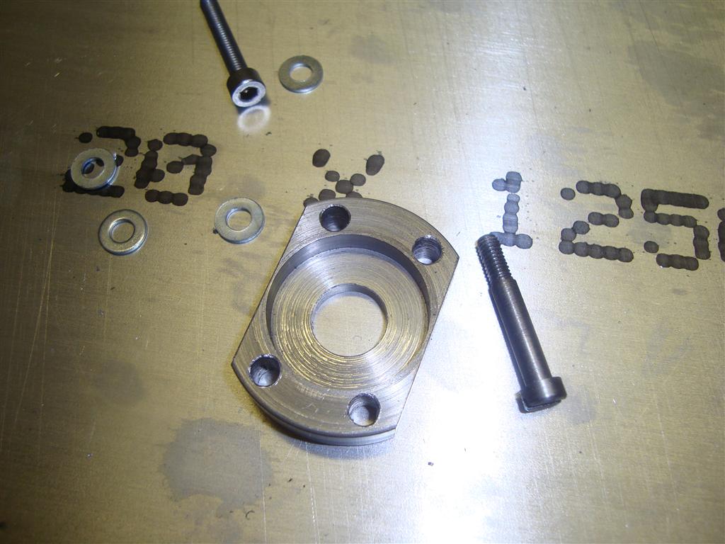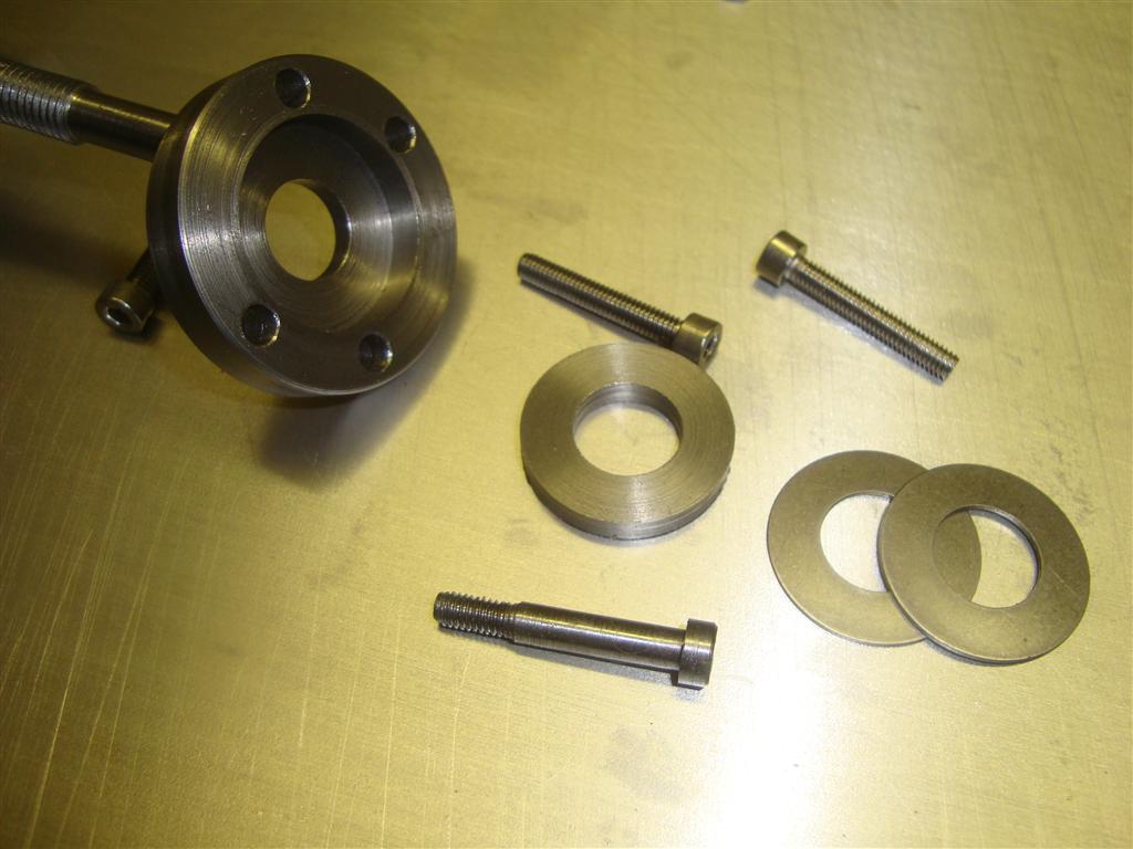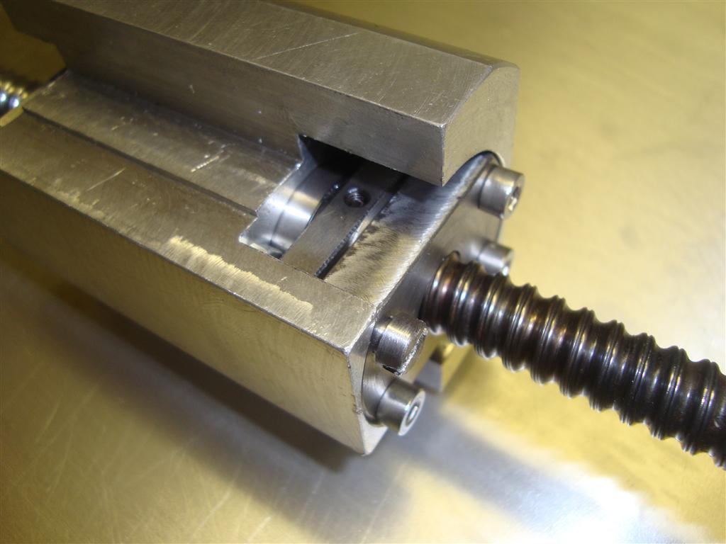 The other goes in this side. On 'top' of that goes a steel spacer, then and end cap to accommodate a pair of beleville washers. This cap is bolted through the ballnut to apply a preload of about 300N and rotationally constrain the ballnut: