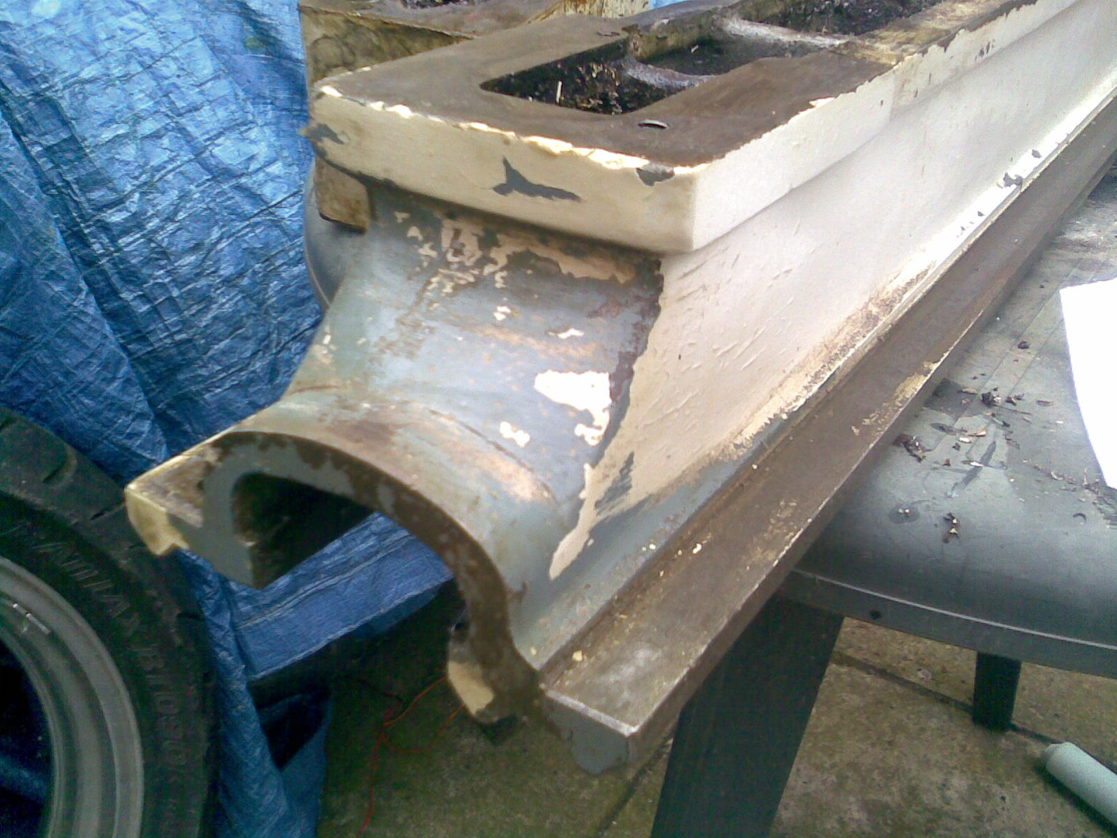 the lathe bed sitting upside down on the table, notice the solid lump of swarf reinforced grease ontop of the foot on the left