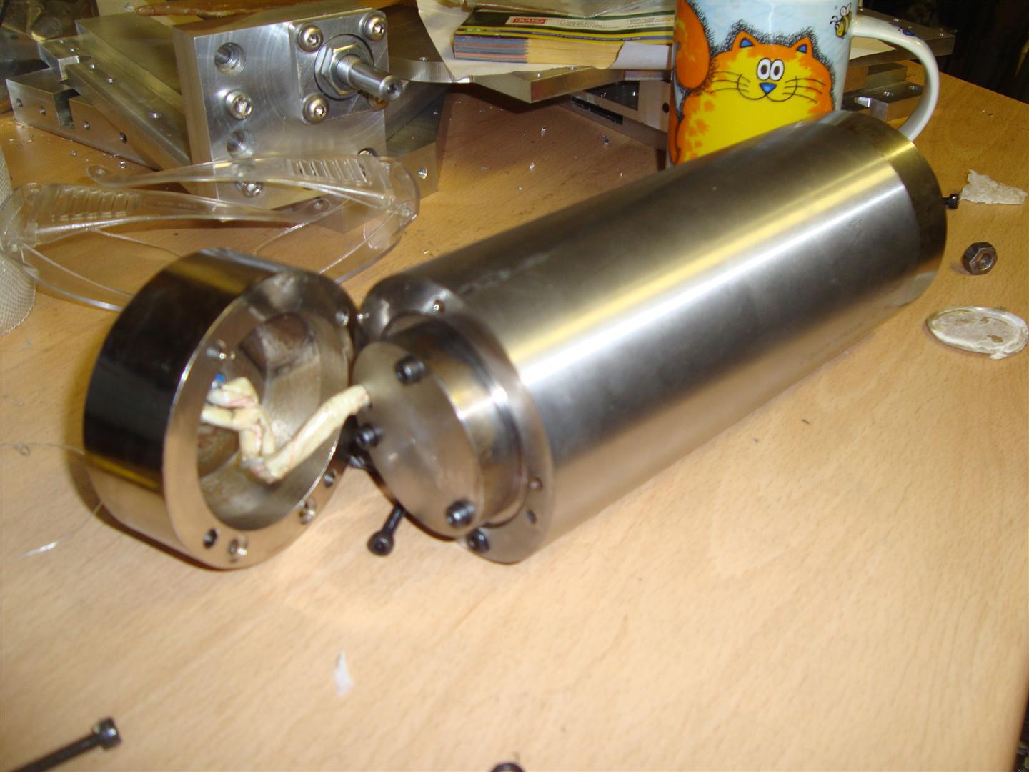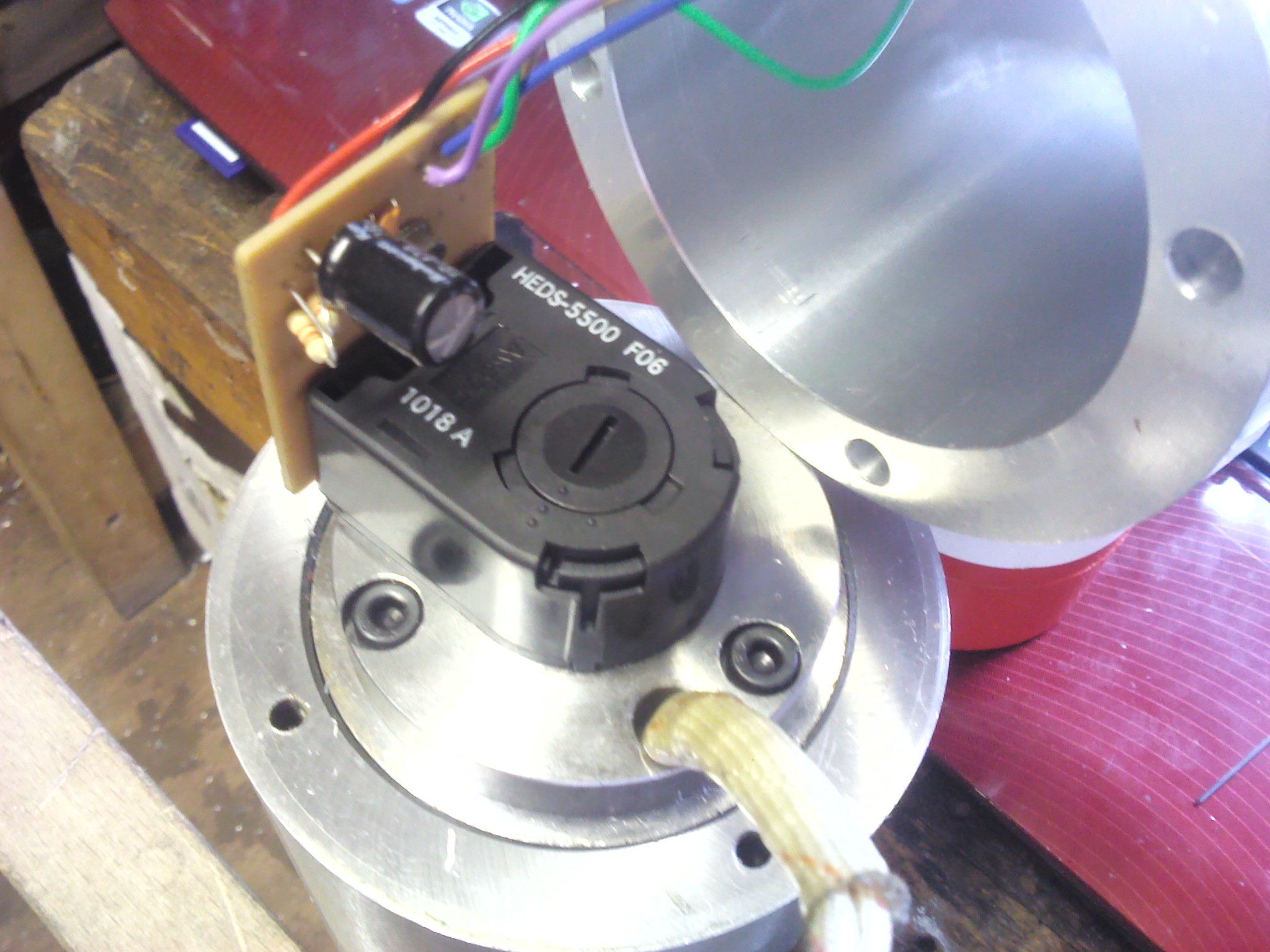 The aforementioned 2.2kW 80mm spindle had the endbell removed, and small encoder shaft was press fitted into a hole drilled into the back of the spindle shaft. To achieve low runout, the inserted shaft was skimmed in-situ from spindle power. The encoder was then mounted, along with a PCB incorporating a PIC microcontroller to add an index pulse and provide a divider on the quadrature output for sensible output frequencies at high speeds. In future, this feedback could potentially be used to accurately compensate spindle speed, PID control of the spindle using linuxCNC or field oriented control.