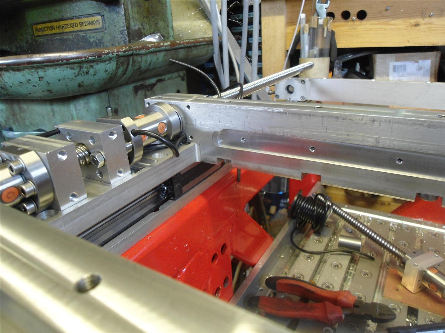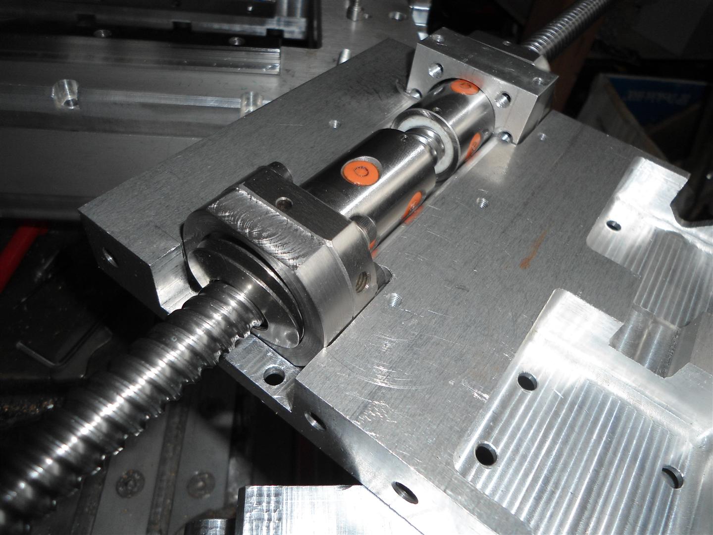 The Z-axis is easy since gravity pre-loads it, due to the large mass of the Z-axis, so there was no need incorporate a second nut here. Although the cutting force parallel to Z could exceed the weight of the axis whilst drilling, a <0.05mm error introduced due to backlash is insignificant here. For the X and Y axes two ballnuts were used on each screw, with one attached as normal and the other preloaded against the screw using disk springs. This nut is constrained rotationally via pins, since any rotation would introduce backlash. Easiest to explain with a picture, so here's the finished mechanism on one side of X, which is identical to the other side: