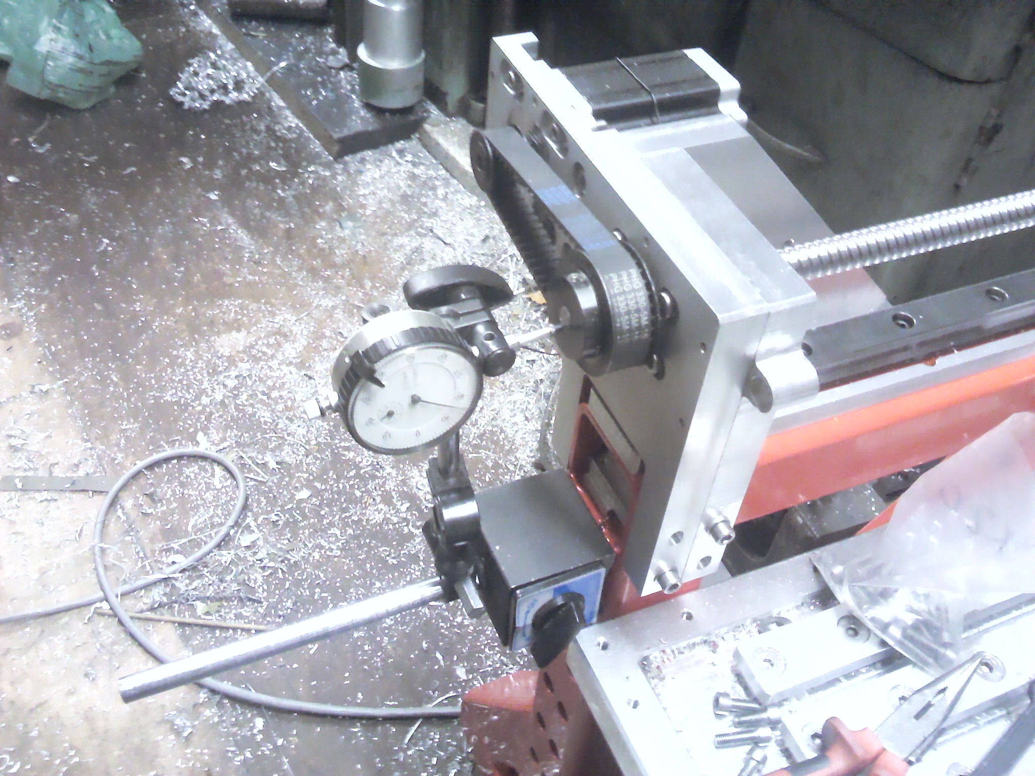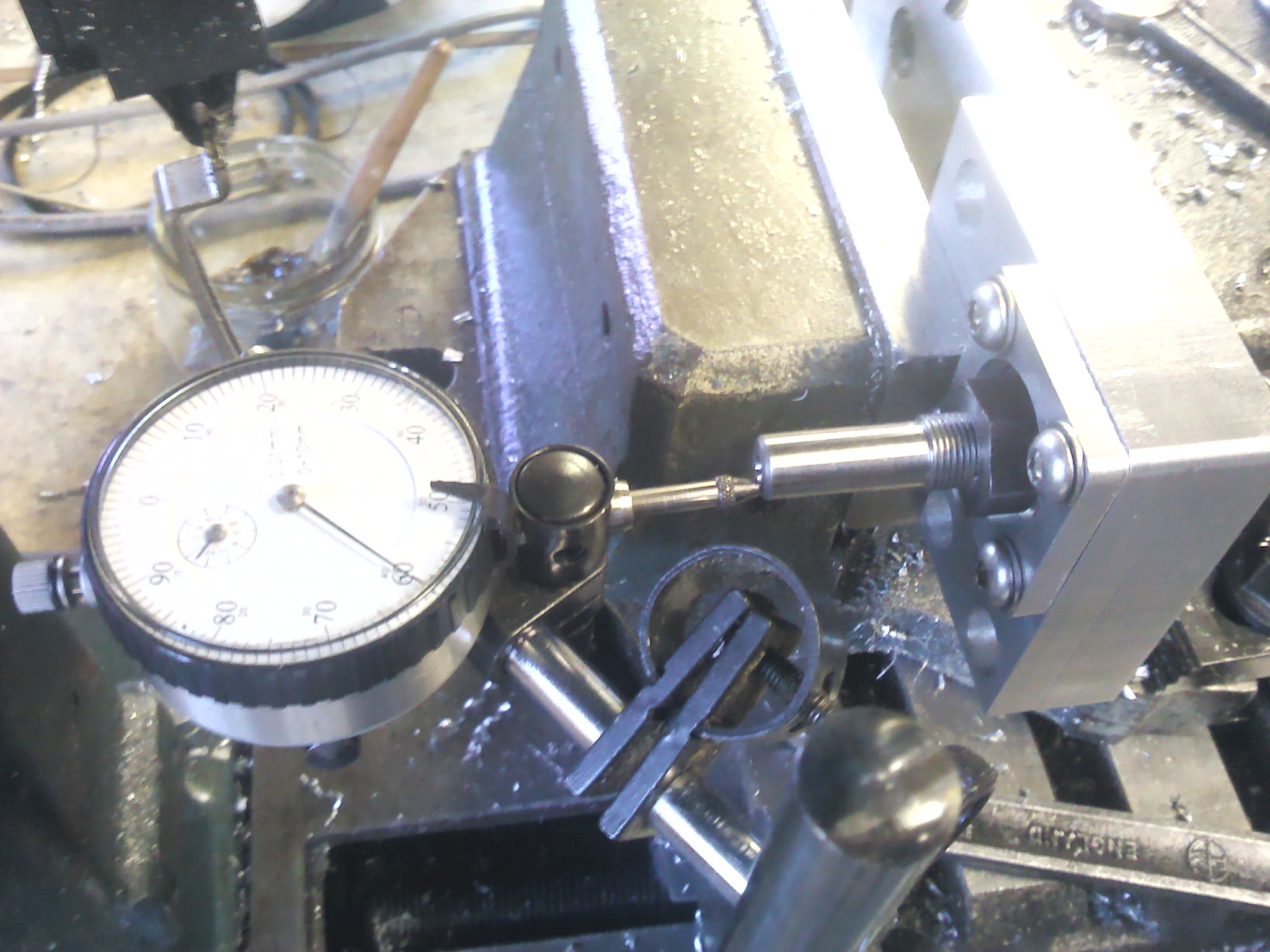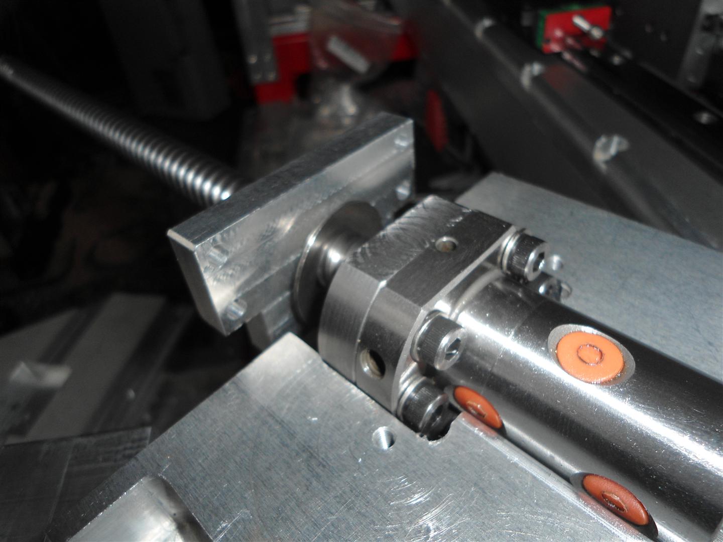 The following images shows us verifying that the bearings on the Z-axis screw are preloaded properly by measuring that there is no end float on each ballscrew: