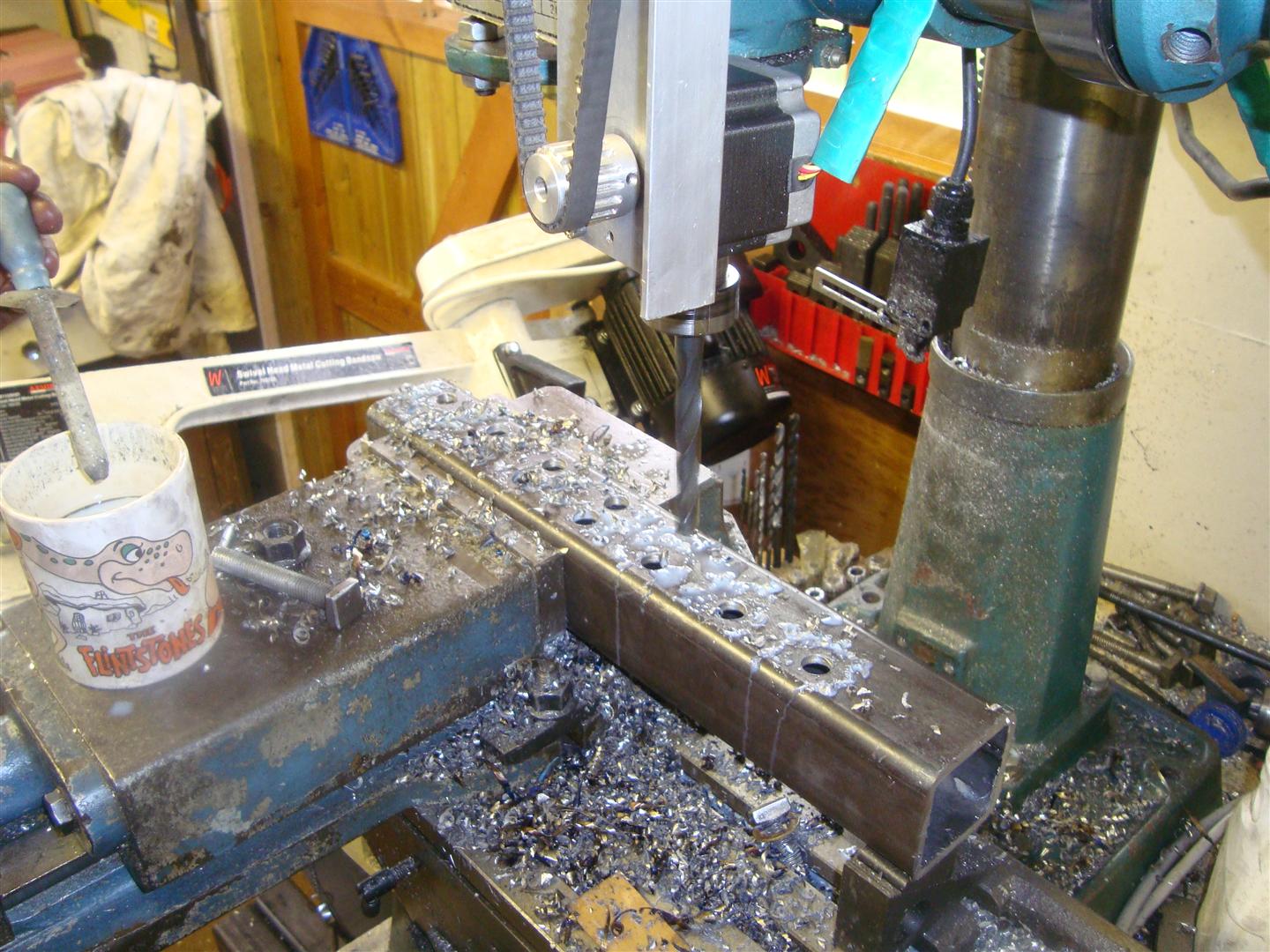 The required stiffness for the machine dictates using an adjustable height bed, so an array of holes were drilled in the frame to accommodate this: