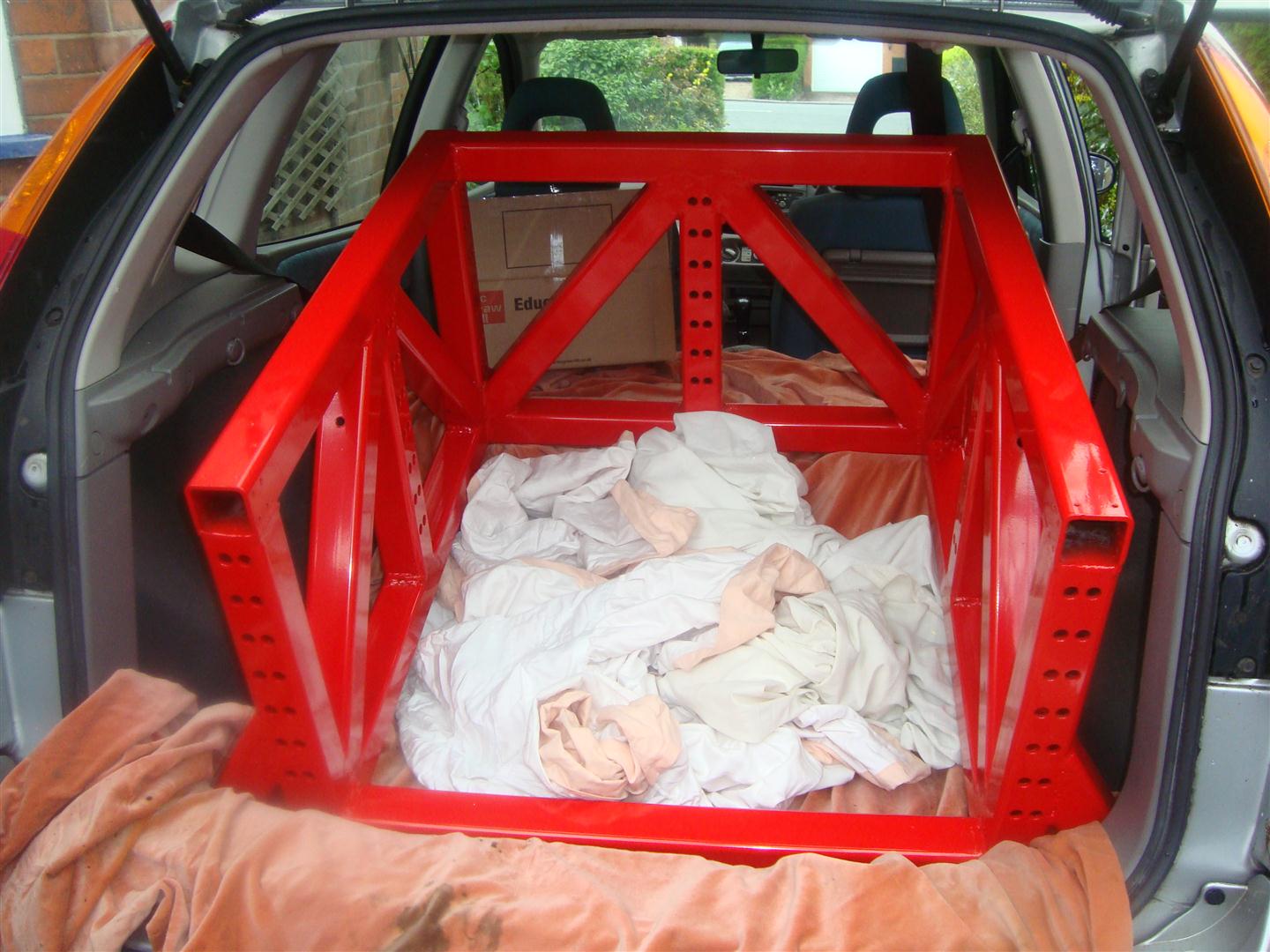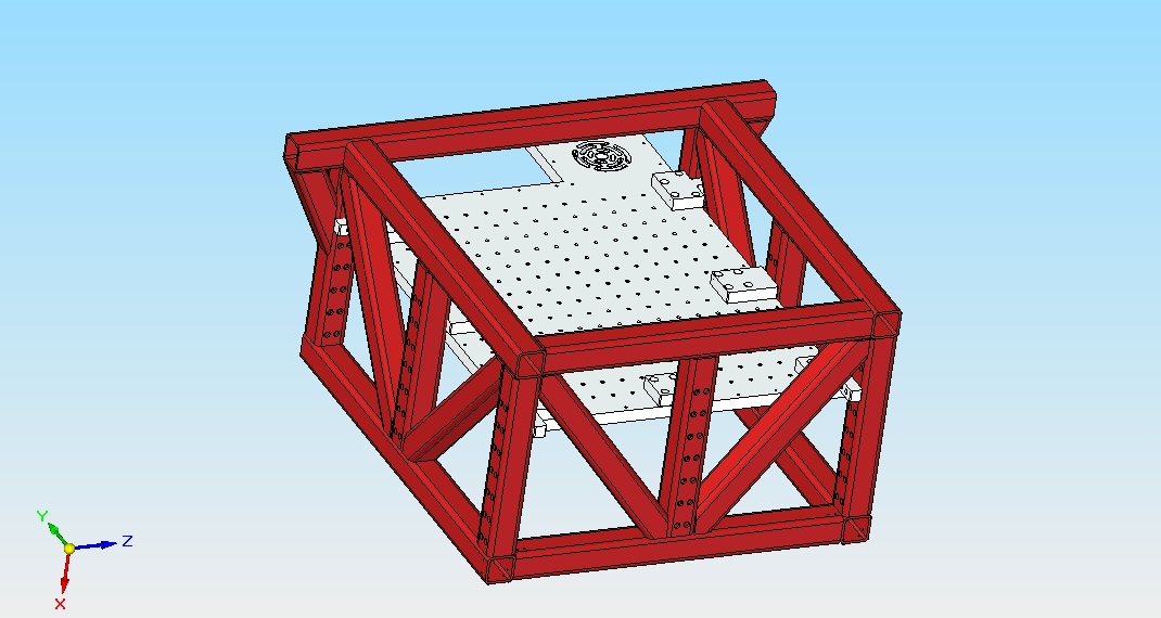 The high stiffness requirement dictated making a substantial frame, however it could not be too heavy for portability reasons. After a suitable mixture of calculation and guesswork we opted for 60x60x5mm box section and a largely generic frame was designed with the obvious diagonals added for additional strength: