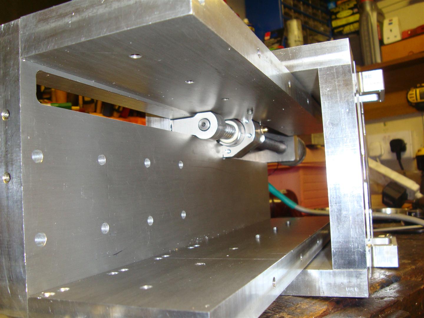 The Y-axis is essentially just a box which houses the Z-axis, and provides a rigid structure linking the Y-axis linear bearings and associated ballscrew. Again, the ballscrew is protected by rotary seals. In order to ensure the perpendicularity of the box and help with tramming, an accurate reference edge was machined on two plates to accurately mount the other two.