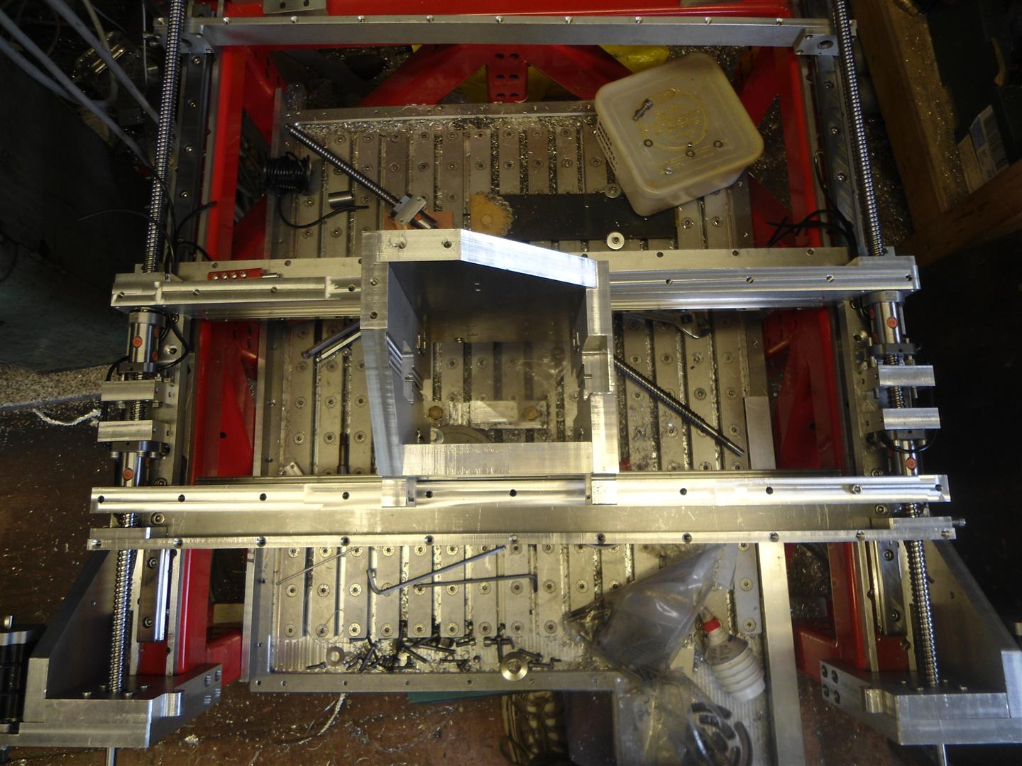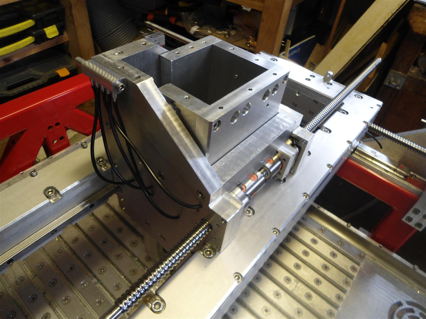 The Z-axis is a rectangular enclosure that contains a ballnut mount and two rails, the bearing blocks for which are mounted on to the Y-axis. Clearly the use of a box structure is substantially stronger than the standard single overhanging plate approach.