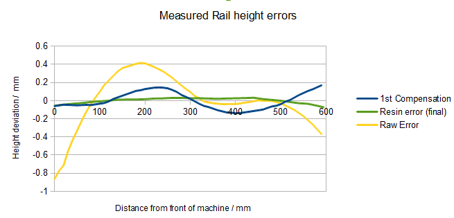 The new error, using the same metric as earlier was extremely small along most of the length of the rail, with a ramp at the end which turned out to be the bearing rubbing on the aluminium resin retainer, which was easily solved, so in the end we obtained a much improved profile accurate to +-0.03mm. Just to emphasise how well the resin worked, here's the original frame error, the first compensation attempt and the resin plotted on the same scale:
