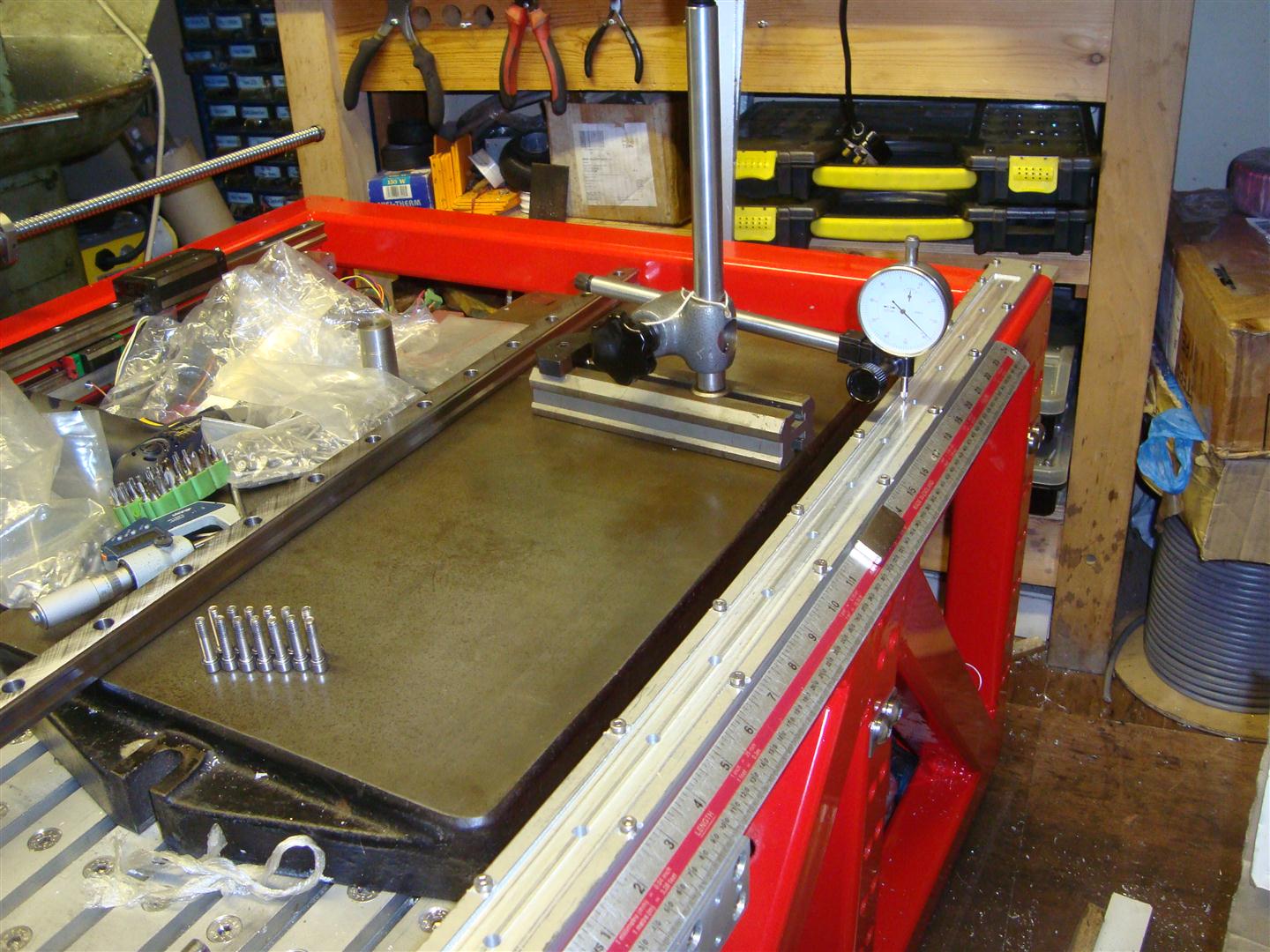 Consequently, we opted for epoxy levelling. Another option would have been to measure the angular and height error, which could be done by taking readings with the indicator on two different length bars, and simple trigonometry, and use this to mill 3D surface to compensate.