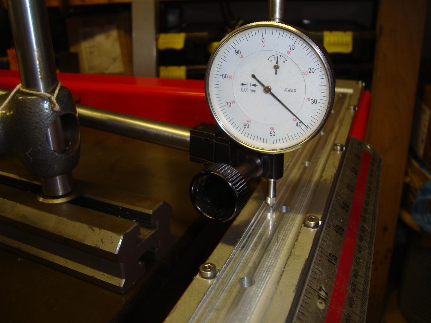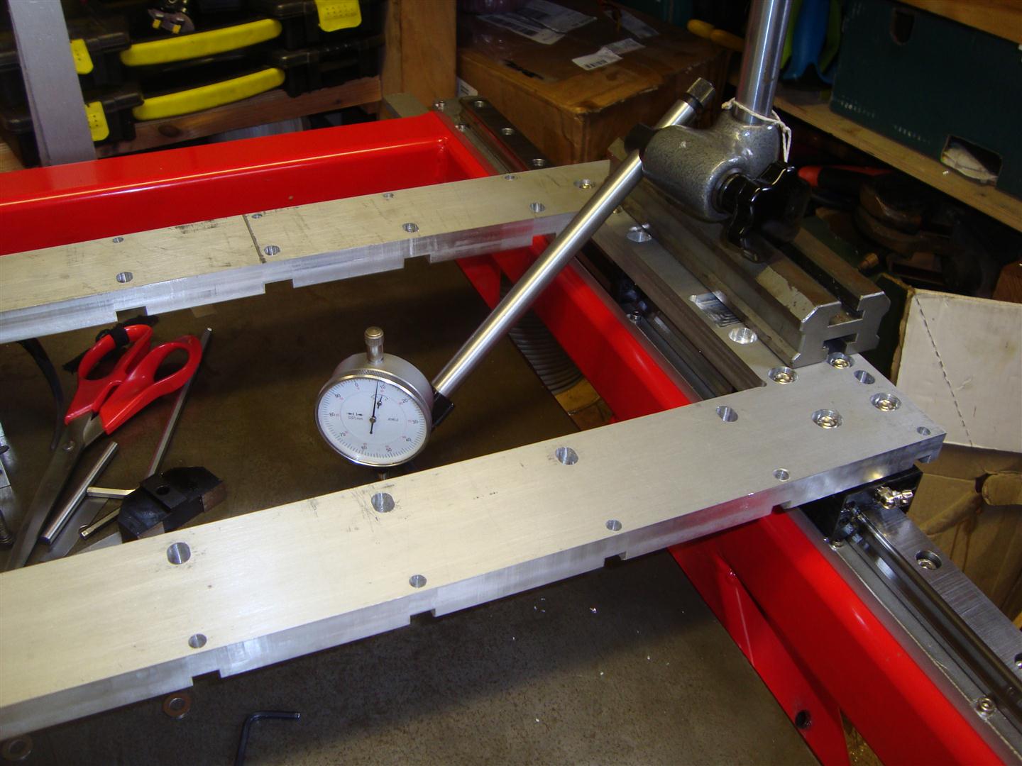 The initial plan was to use that graph to machine an aluminium strip, which the opposite profile on, such that when it is bolted to the frame the errors cancel out to leave a straight line, i.e. flat surface. Clearly it is important to make sure that this profile is machined on to the aluminum accurately, so we used my CNC router and made a jig to hold the aluminium strip. By surfacing the jig on my CNC router, then bolting the aluminium strip to be machined on top, any error due to my X-rails is cancelled out. That just leaves machining the correct profile, which I did by making a spreadsheet to generate the g-code to move the cutter through the correct path. To measure the initial error, we bolted the rail to the aluminium strip just machined flat, placed a dial indication on one bearing block and indicated to the surface plate. Unfortunately I don't have a picture of this, but it's the same as this setup except the rail is mounted on the aluminium:
