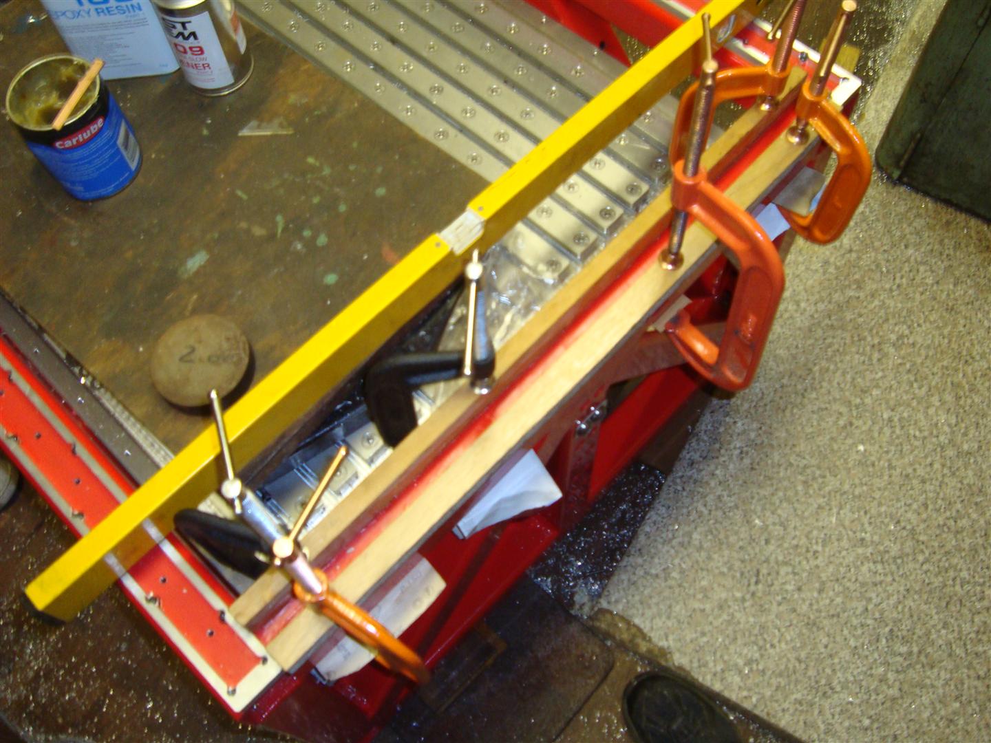 The epoxy chosen was west system 105 with 209 hardener, since this is the lowest viscosity we could find and the long curing time gives it more time to set level. Two aluminium barrier pieces were cut and a temporary barrier was made across the back for resin to flow between each side, so that both surfaces end up at the same height - i.e. in the same plane. This was the setup: