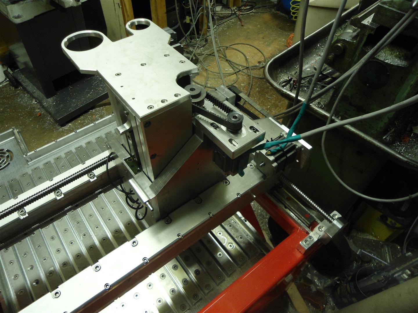 Initially, the spindle was mounted on up to four 20mm thick spindle mounts, however due to problems with low thread engagement, this was later upgraded to two much thicker mounts I machined from 60mm thick pieces of 4" square bar for better rigidity.