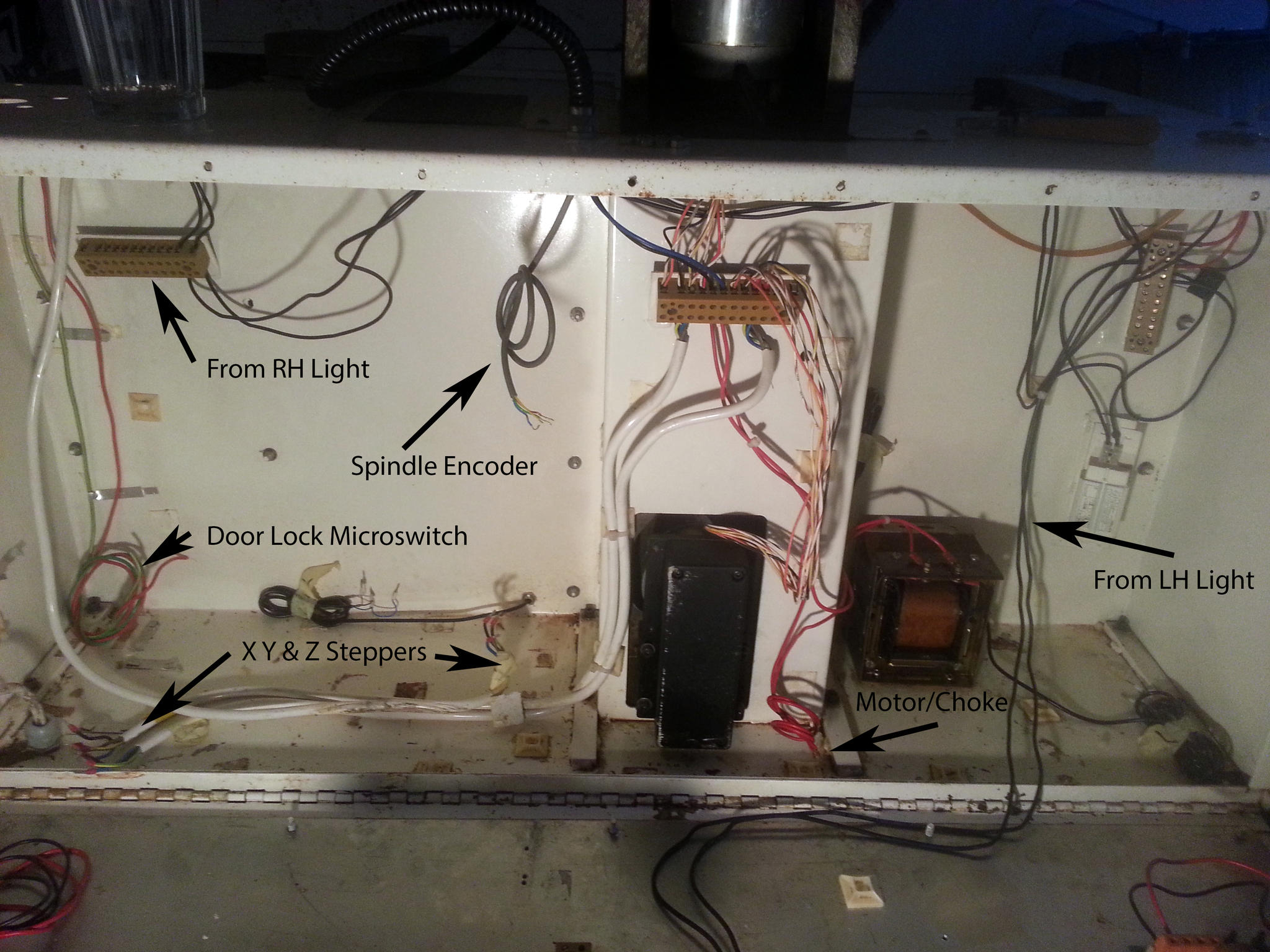 ground from the mains is earthed to machine the big aluminium plate. Live goes from the input, to the key switch, then back to the reset fuse the green and red button thing on the side, then back down to filter and spindle. I have my complete wiring diagrams at work, so will add them to my Flickr pool for you to see.