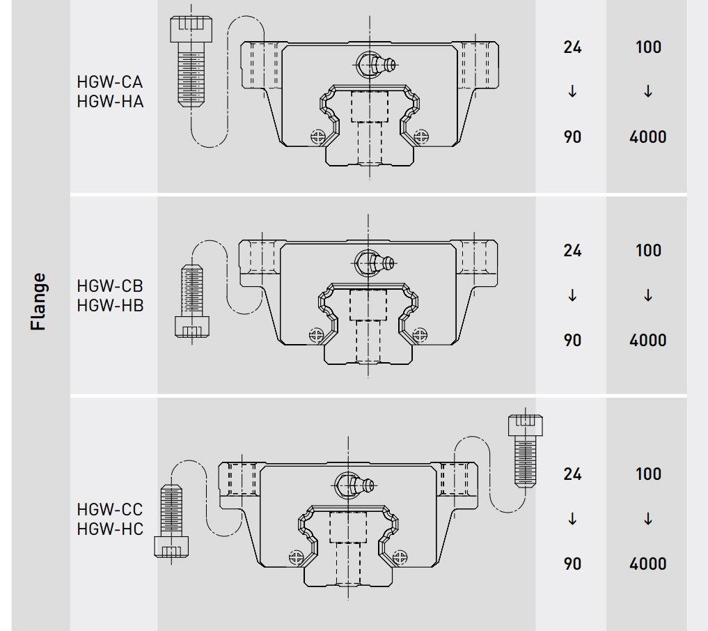 I'm a bit confused, looking at hiwins dimensional section in the spec sheet for the HGW-CB/HB carriages, it looks like they still bolt from the underside, it doesn't look like they have a through hole but also looking further down, the A/B at the end denotes top or bottom mounting so I think the drawings wrong?