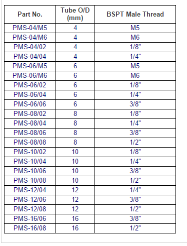 Below is a table for quick hose connectors. Left is the tube, right is the fixtrure side thread.