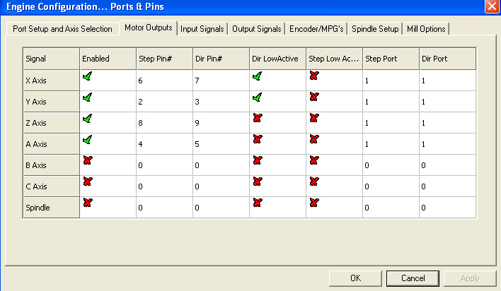 Here are the settings I was using for the standard Mach3 parallel port driver.