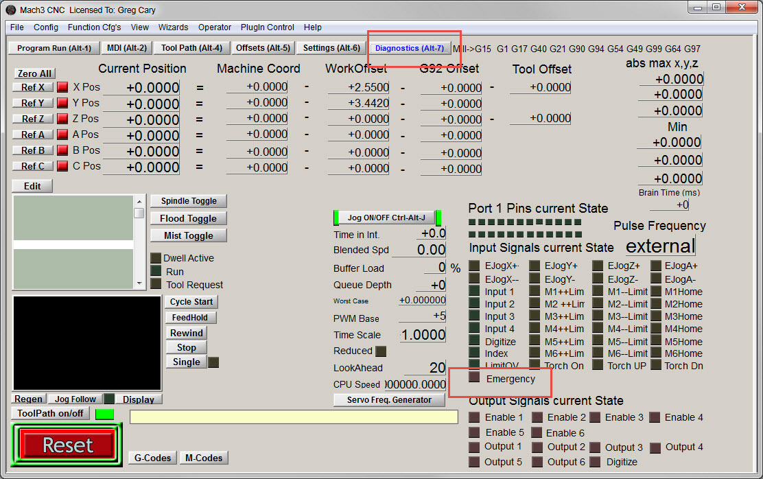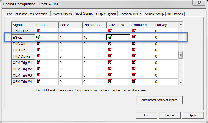 1) The first message it gives when starting Mach3 is that no E-Stop has been assigned to an input on the ESS. Actually, I don't have a hardware E-Stop I've always used the Esc key on the computer. What to do? I will also need to assign the home switches.
