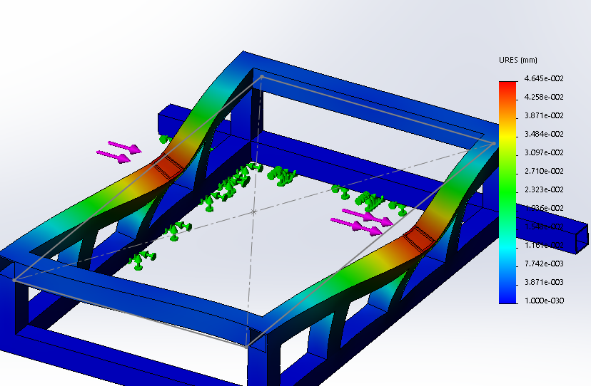 Stiffness; 51 N/um. The side bracing gave 4.7 times higher stiffness. Success! (I tried a lot of different potential setups before deciding on this one)