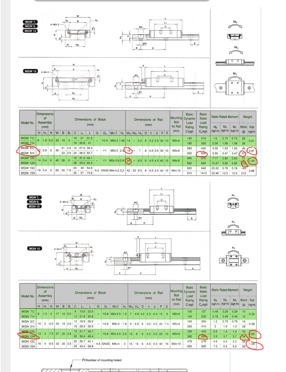 As you see above at the snip, rail width and especially weight were main consideration as obviously 9, 12, 15 both normal or wide will work . But i believe 12H block and rail 12 size will work best as a compromise between block length, block weight, rail weight for printers up to 500x500x500 cubes.