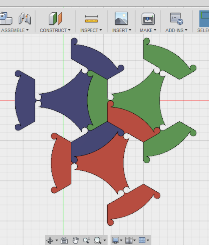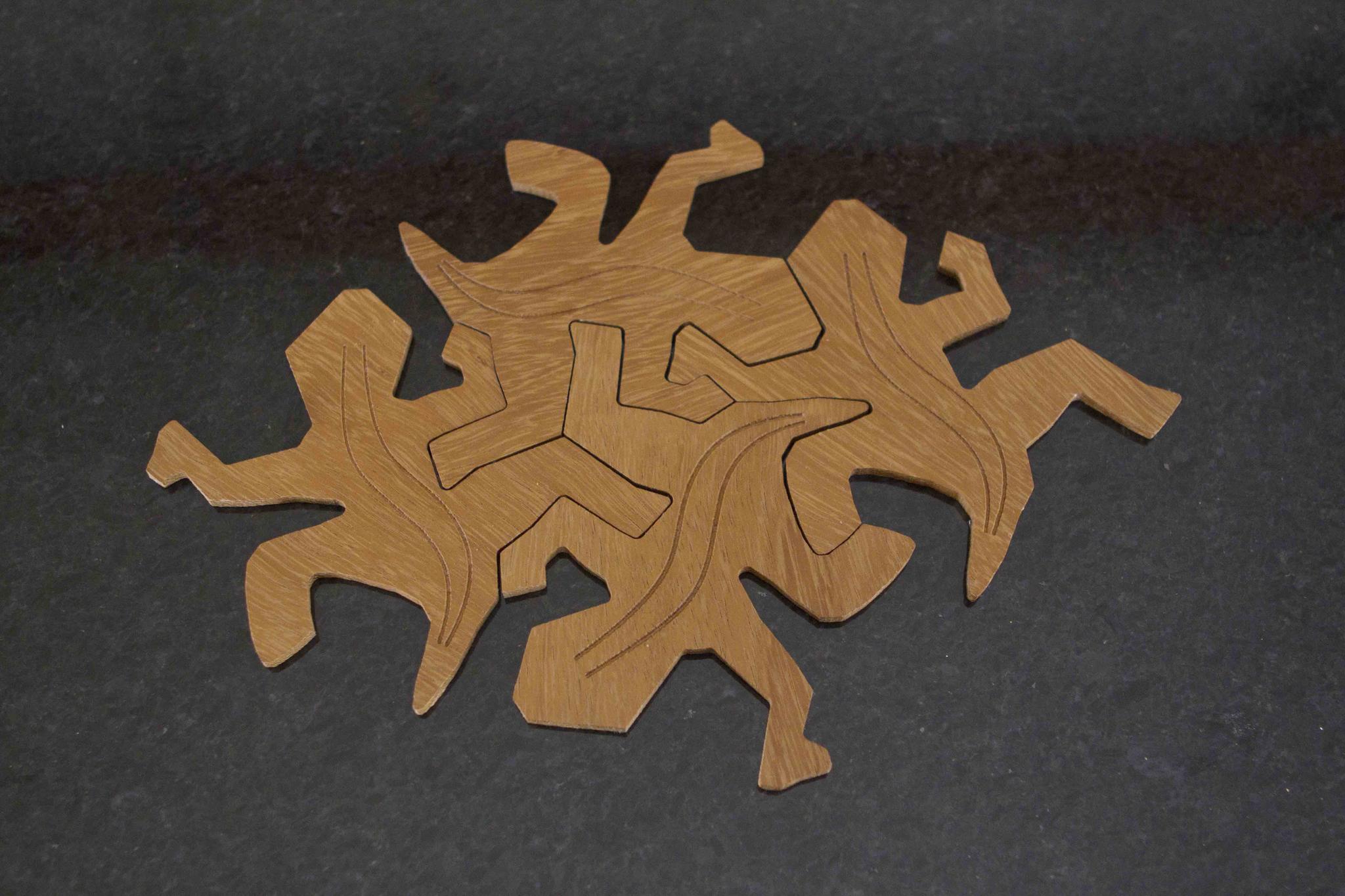 It all reminds me of this, again based on deformed hexagons but with no symmetry (although in that case the guy took a very roundabout route to generate his gcode). Both designs are necessarily a bit wasteful as you cannot cut the interlocked figures and you just have to try to fit them on the material as best you can. I recreated this latter design from scratch to use for sets of coasters which will then interlock across a table-top. The design in this thread would work quite well for the same kinds of things.