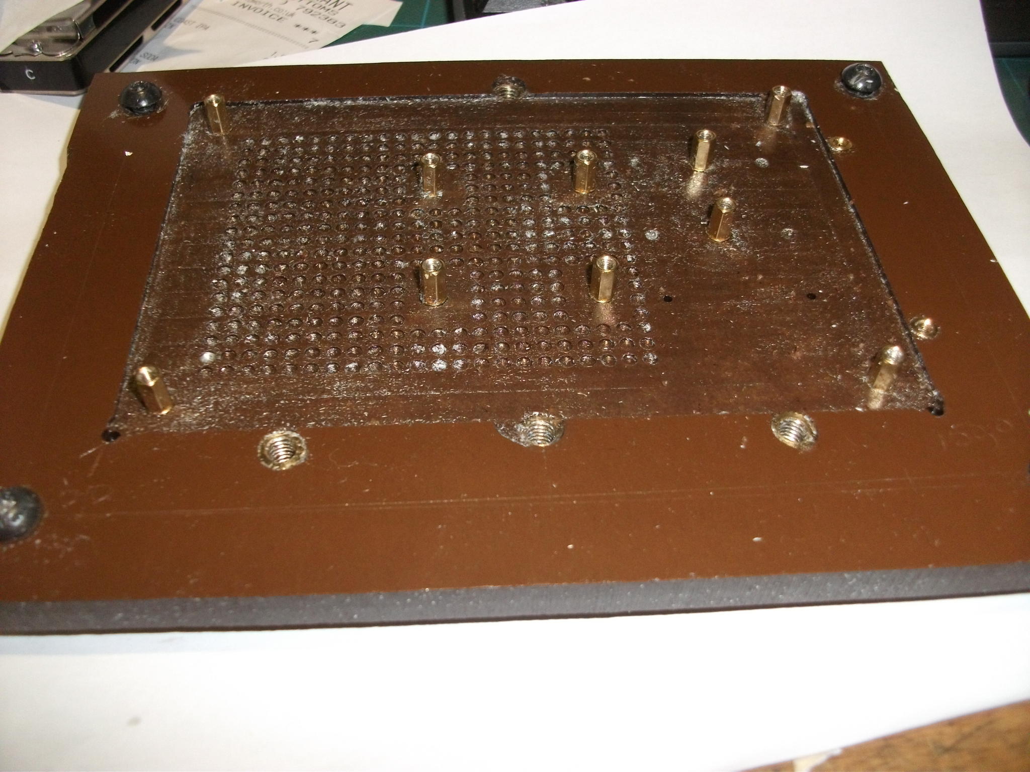 I have got a sheet of 10mm thick paxolin marked out ready to cut to size to fit my machine bed and drill with a matrix of holes 45mm apart (so that they coincide with the T-slots) the holes then have M6 brass inserts pulled into them with a smear of araldite as lubricant. I plan to use this as a permanent sacrificial bed. For the moment I am just making up jigs for each job, like this one