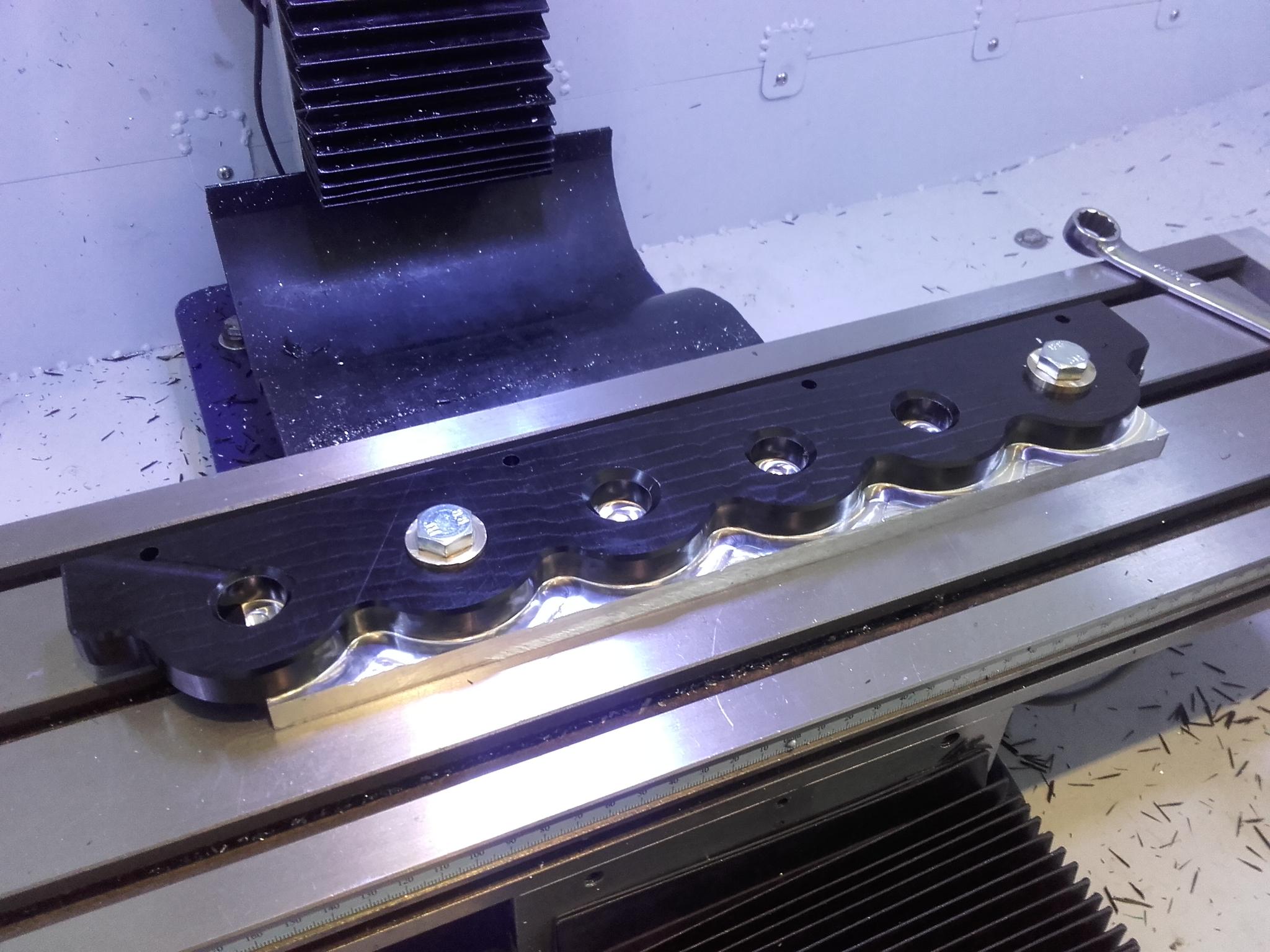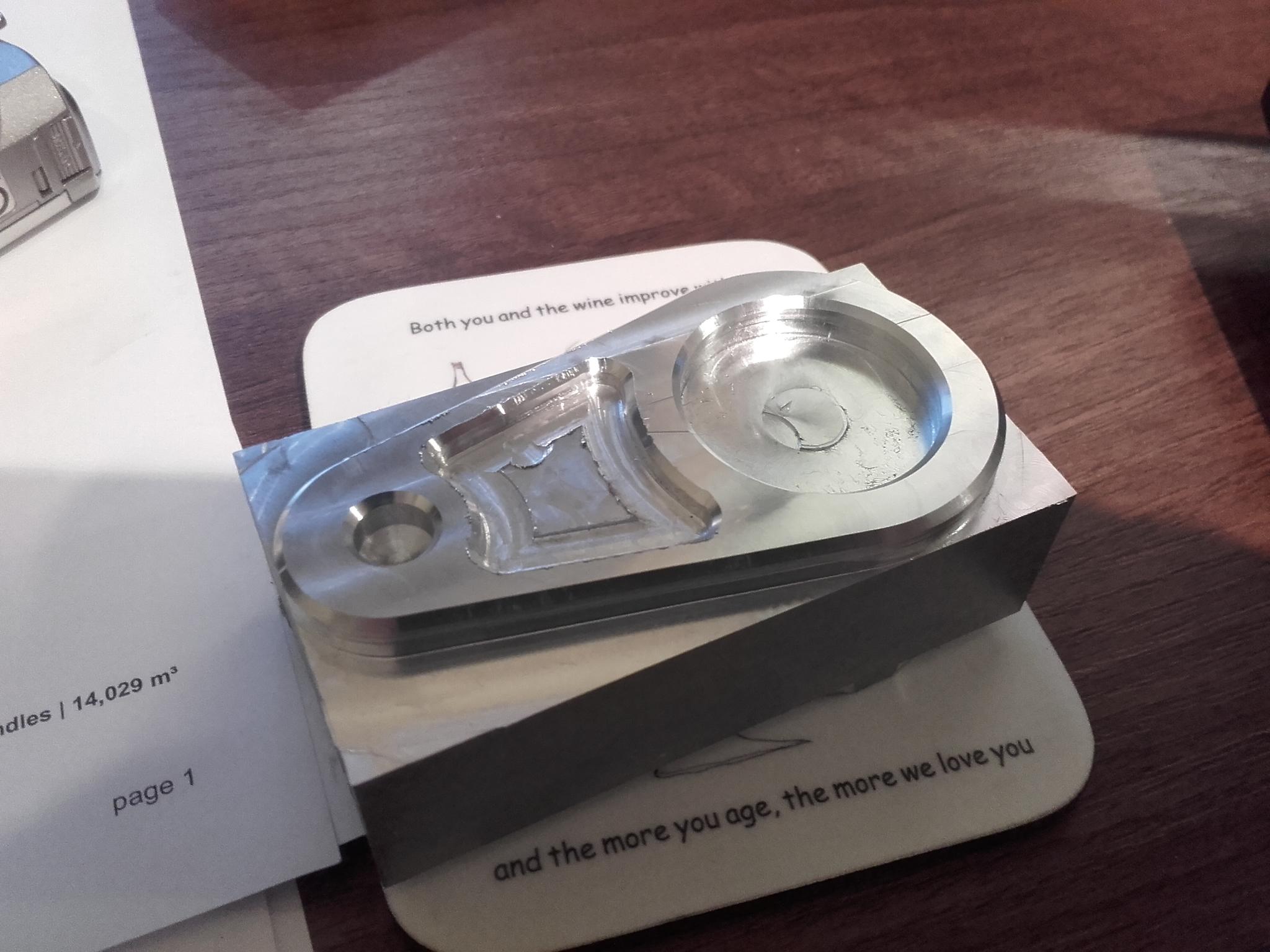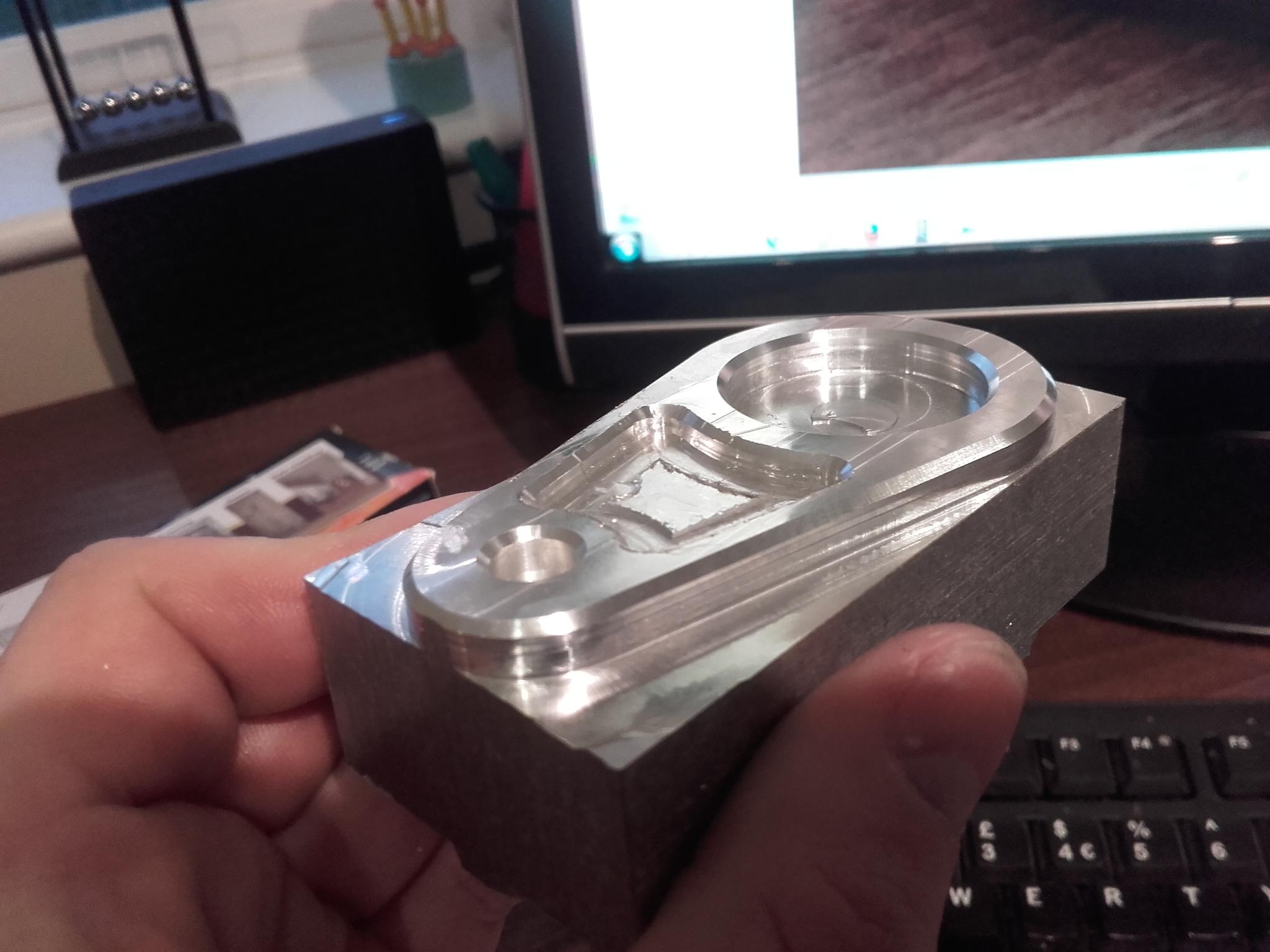 Thought I'd make a tooling holder as a practice project. Haven't quite got the hang of the settings in Fusion 360 for chamfering yet, plus when I had Mach3 in feed hold and was restarting it did a preparatory move and milled a channel right across the piece (under my thumb in first pic) :upset:.
