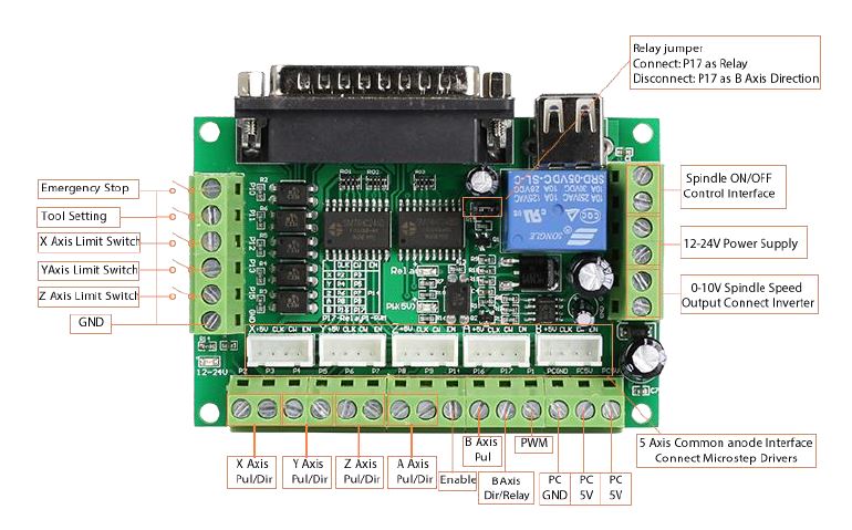 The other is a generic 5 axis BoB (image attached). I have connected this up, and everything works except the spindle control. I have the AN1 0-10V connected to the + pin on the board and the COM to the GND. The X1 (FWD) pin is connected to pin 17 on the board.