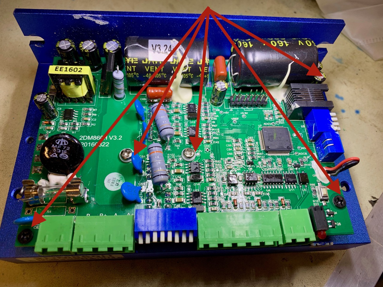 Highlighted - 3 black screws that hold the board to the heatsink. 2 silver screws set into plastic top-hat isolators that secure the power electronics firmly to the heatsink.