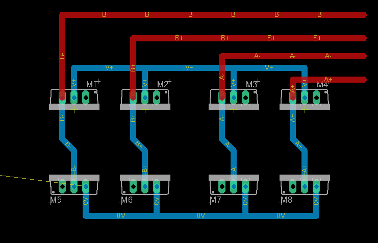 Parallel, and to the right of the top four of these are the stepper driver connections, labelled (top to bottom) "B-", "B+", "A-", "A+". If you look at the 8 MOSFETS, there's 4 pairs, vertically aligned. The left-most is driving the "B-" stepper; to the right of this drives the "B+" phase, then the "A-" and the "A+"