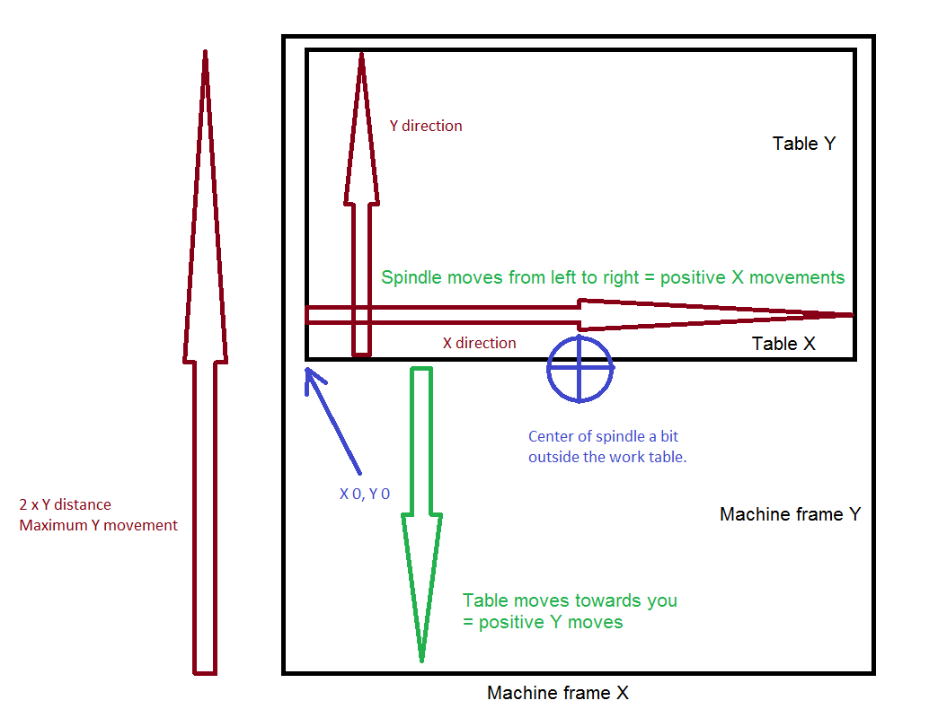 Yes, but when the table is moving towards your belly the Y axis value is actually increasing, so the arrow is moving away from you (imaginary movement). So mathematically it is the same as with a moving gantry type of machine and the same G code can be run. In a moving table machine the X, Y zero of the table is the left bottom corner of the table, same as a moving gantry type of machine.