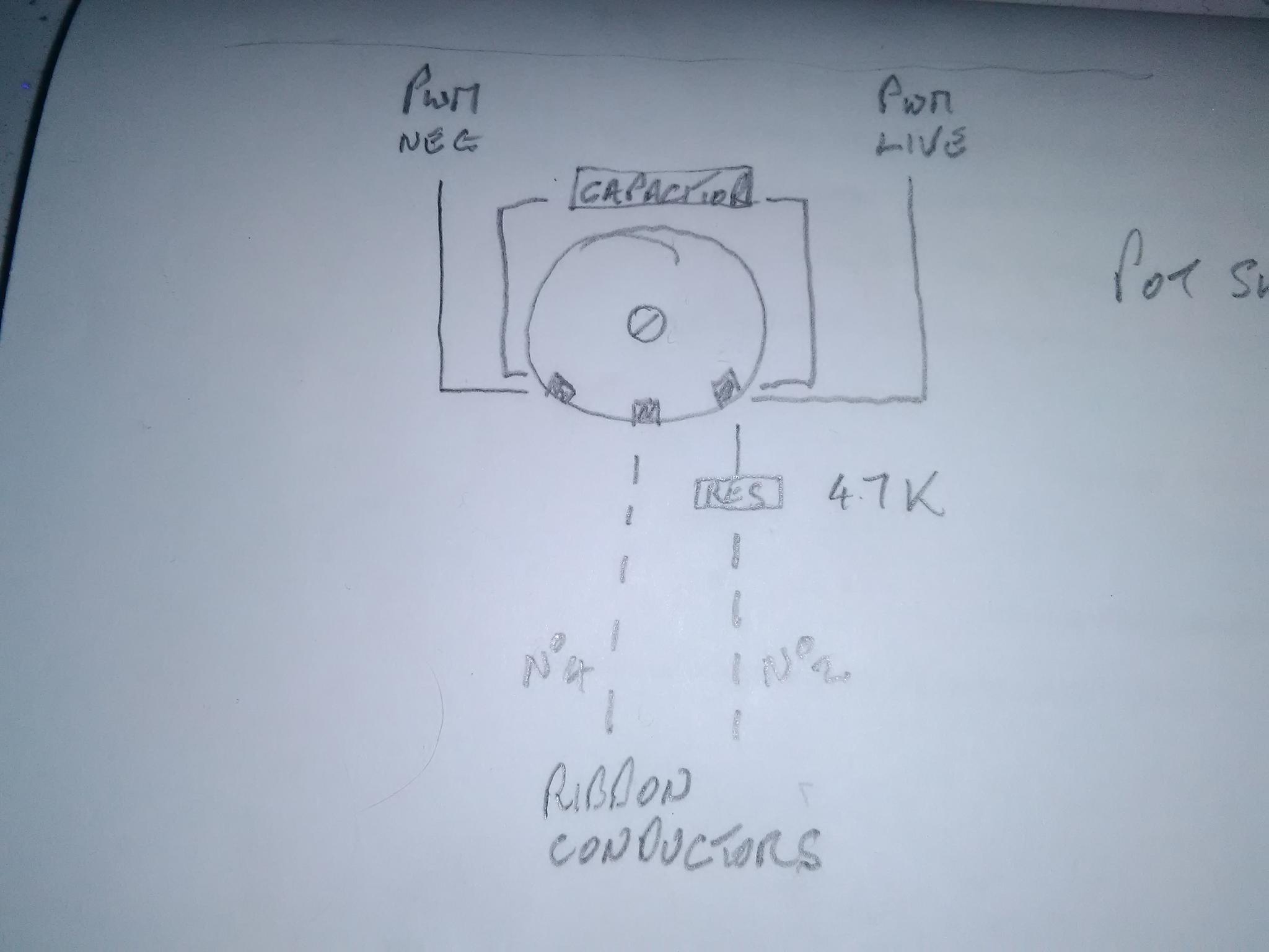 Trouble is this (electrics) isnt really my field, and was wondering if anyone could do me a schematic sketch as to how pwm wires should be connected to the pot?, the original wiring was a bit of a dogs breakfast, but included a 5k resistor and capacitor (assume as part of a smoothing circuit)
