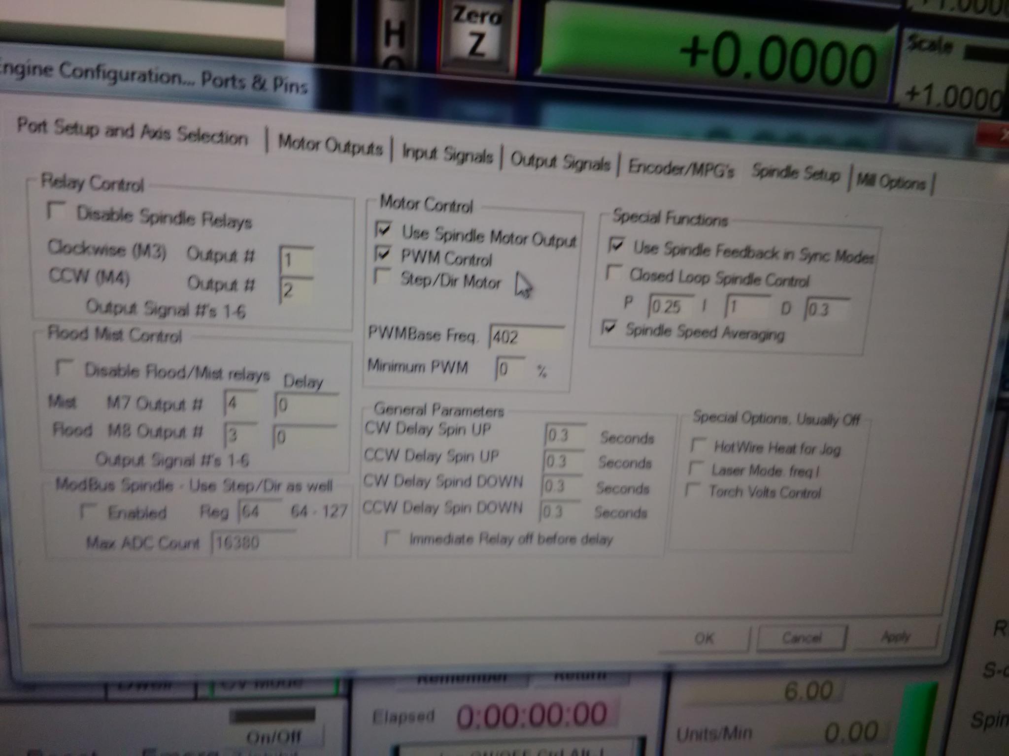 My intent, when you issue lets say a speed of S1000, that the actual speed would be a ratio of the commanded speed vs the maximum spindle speed - so if the max spindle speed was set within Mach to 2000rpm, then a S1000 command would set the PWM output at 50% Mark/Space. If the max spindle speed was set within Mach at 4000rpm, then the same S1000 command would set the PWM output at 25% Mark/Space ratio. My comment was to ensure that the commands that you issue to test the speed control would respond with a sensible response from the PC/machine.