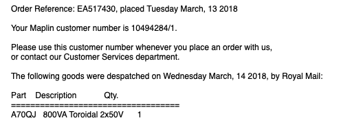For reference, I also bought a toroidal tx from Maplin on closure...