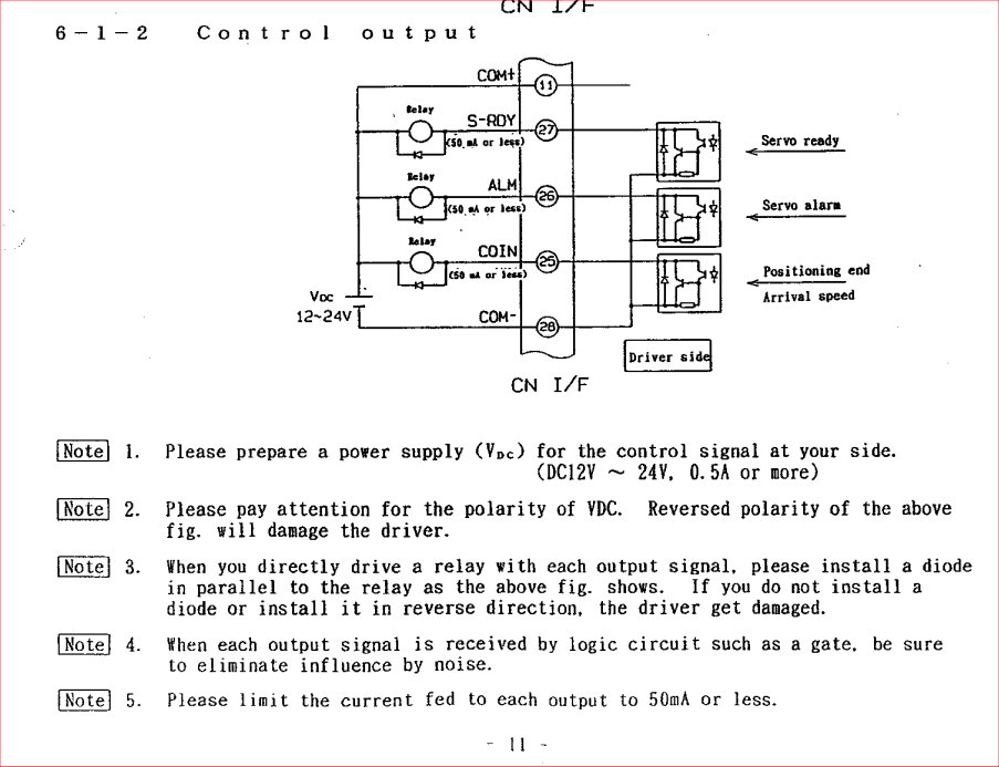 Note 3 in the diagram ("When you directly drive a relay with each output signal, please install a diode in parallel to the relay as the above fig. shows. If you do not install a diode or install it in reverse direction, the driver get damaged") refers to a completely different beast. Inductive loads (the relay coil is one) have a behaviour which, energised creates a magnetic field (in fact, that's how the relay switches - it's an electromagnet that attracts the contactor that provides the electrical switch). When the driving power is removed from the coil, the electromagnetic field collapses, inducing a voltage into the coil of the relay. This flows in reverse and is proportional to the speed at which the driving current is removed - fast = big voltage. This can present a voltage at the OUTPUT of the servo controller that far exceeds the 24V you've connected, and destroy the circuitry. The purpose of the diodes in the diagram you included essentially clamps that current flow between the coil and the diode - safeguarding the servo controller.