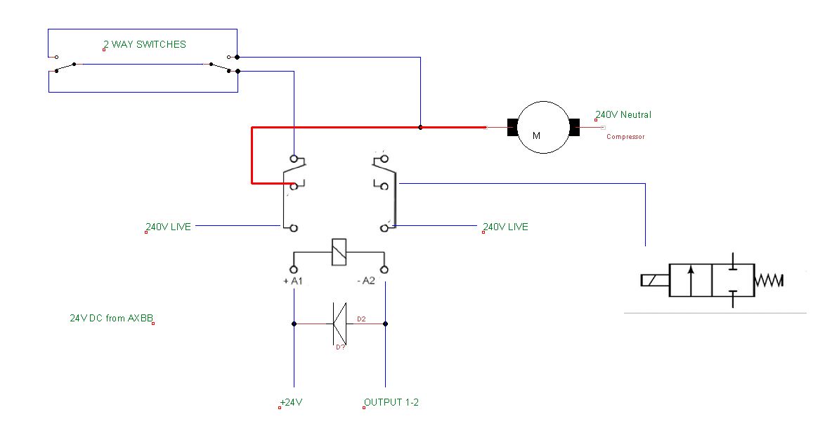 Regarding the compressor being left on I already have a signal lamp which comes on when the compressor is powered - this was put in before the 2 way switches as the compressor was often left running! The lamp is visible from our in workshop CCTV camera and we have a networked smart switch so the compressor can be turned off remotely