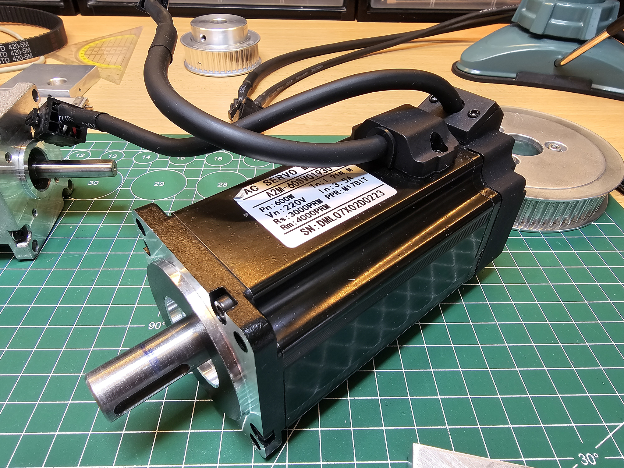 While the 180W 50V DC servo works surprisingly well, I want some more torque and higher RPM, so I bought a 600W AC servo. This motor will allow me to change the gearing from 1:3 to 1:1.5 so I will get a maximum chuck RPM of 2000 instead of 1000. I think the motor will be strong enough for me at that speed.