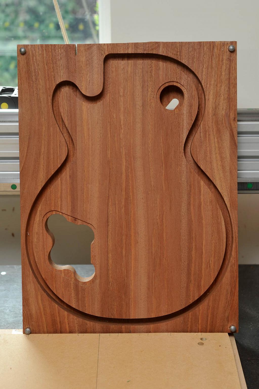 The body is made from African Mahogany, its actually a four piece body, primarily as I got the wood cheap and figured if I end up mucking it up, then I wouldn't be as devastated as if I trashed a pricey Brazilian Mahogany body blank. The body requires machining on both sides so I had a bit of homework to do in regards to flipping the workpiece over and realigning with steel pins. The mahogany was routed and weight relieved in preparation to having a maple cap added ....