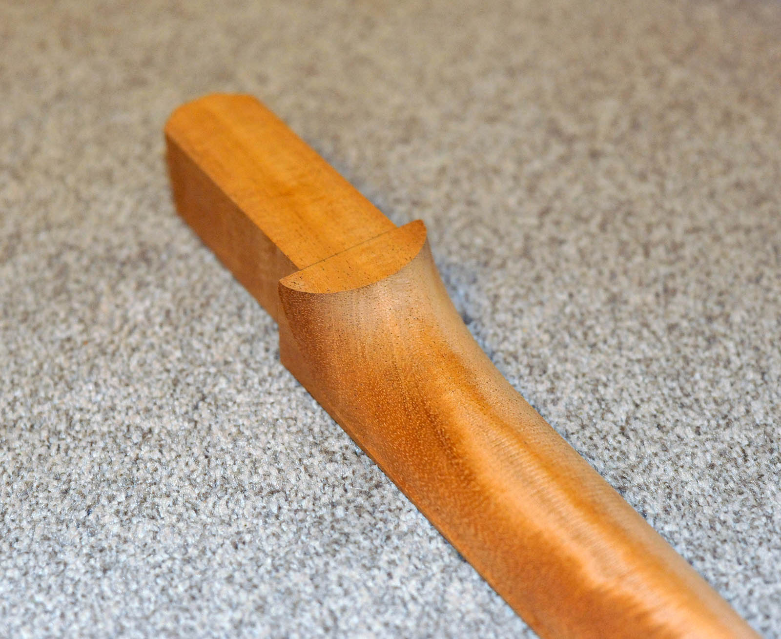 That neck was finished with a 1mm steover parallel pass. I could have quite easily set it to something lower but it would increase machining time. Hell, I could have set it to 0.1mm stepover but personally I dont see the point. You are going to be sanding the neck anyways, It may appear to you like there are alot of machining marks, but 120 grit sandpaper will have that neck smooth in a matter of minutes. Plus, with something like a neck it is going to be refined further before completion, the shoulders of the neck will need blending with the fretboard as I have left the neck a little wide to give me a bit of wiggle room when glueing the fretboard on.
