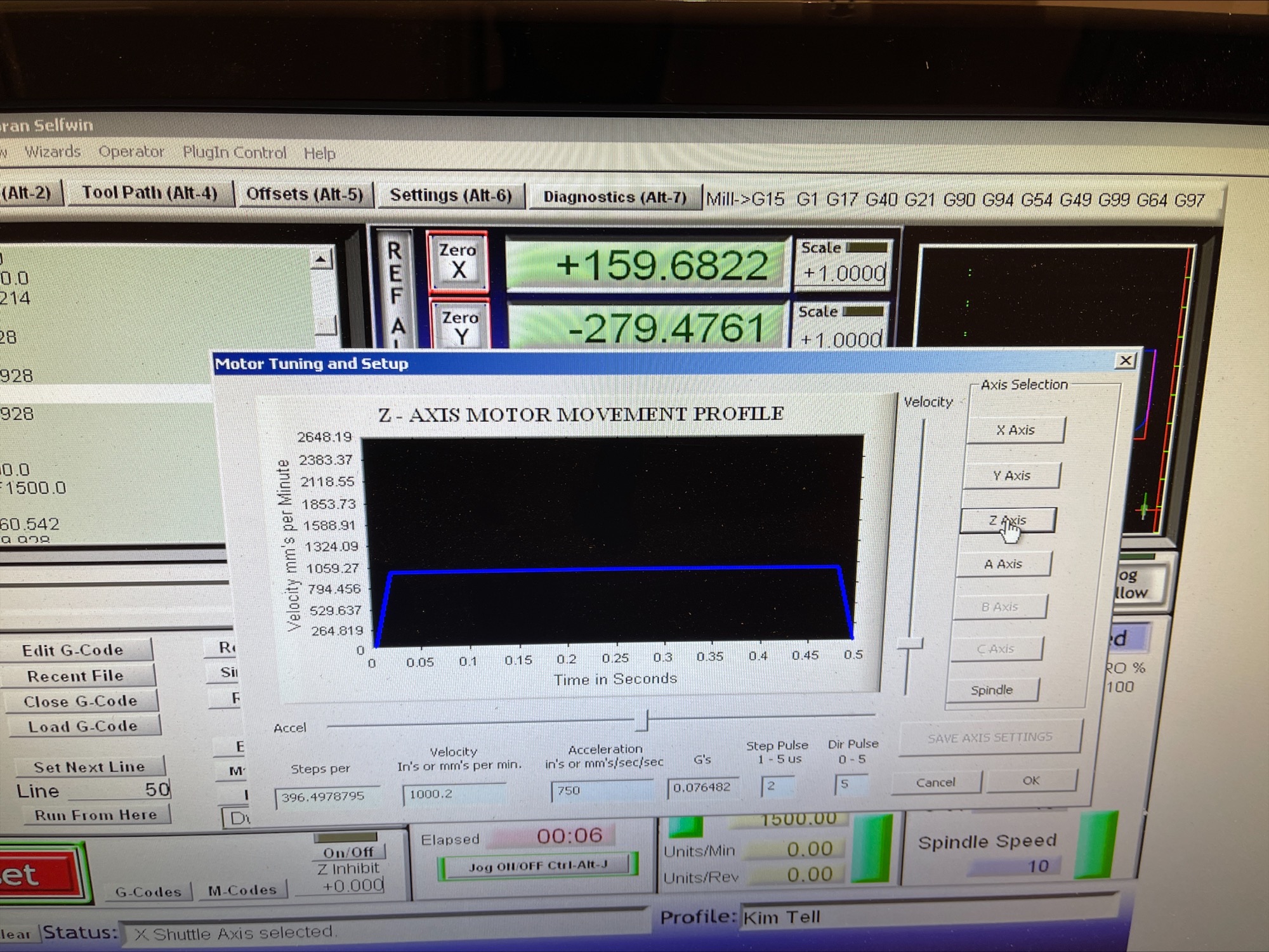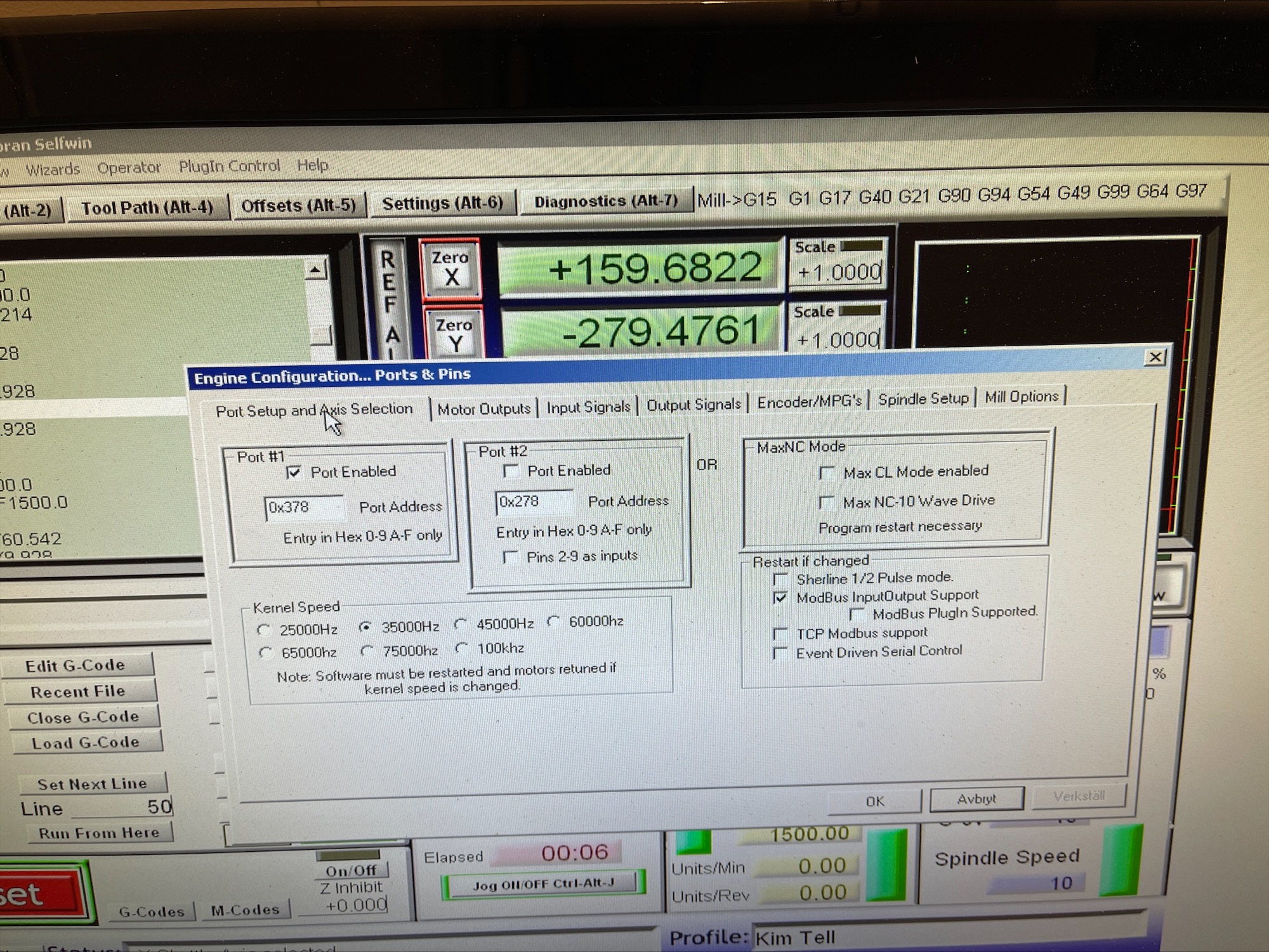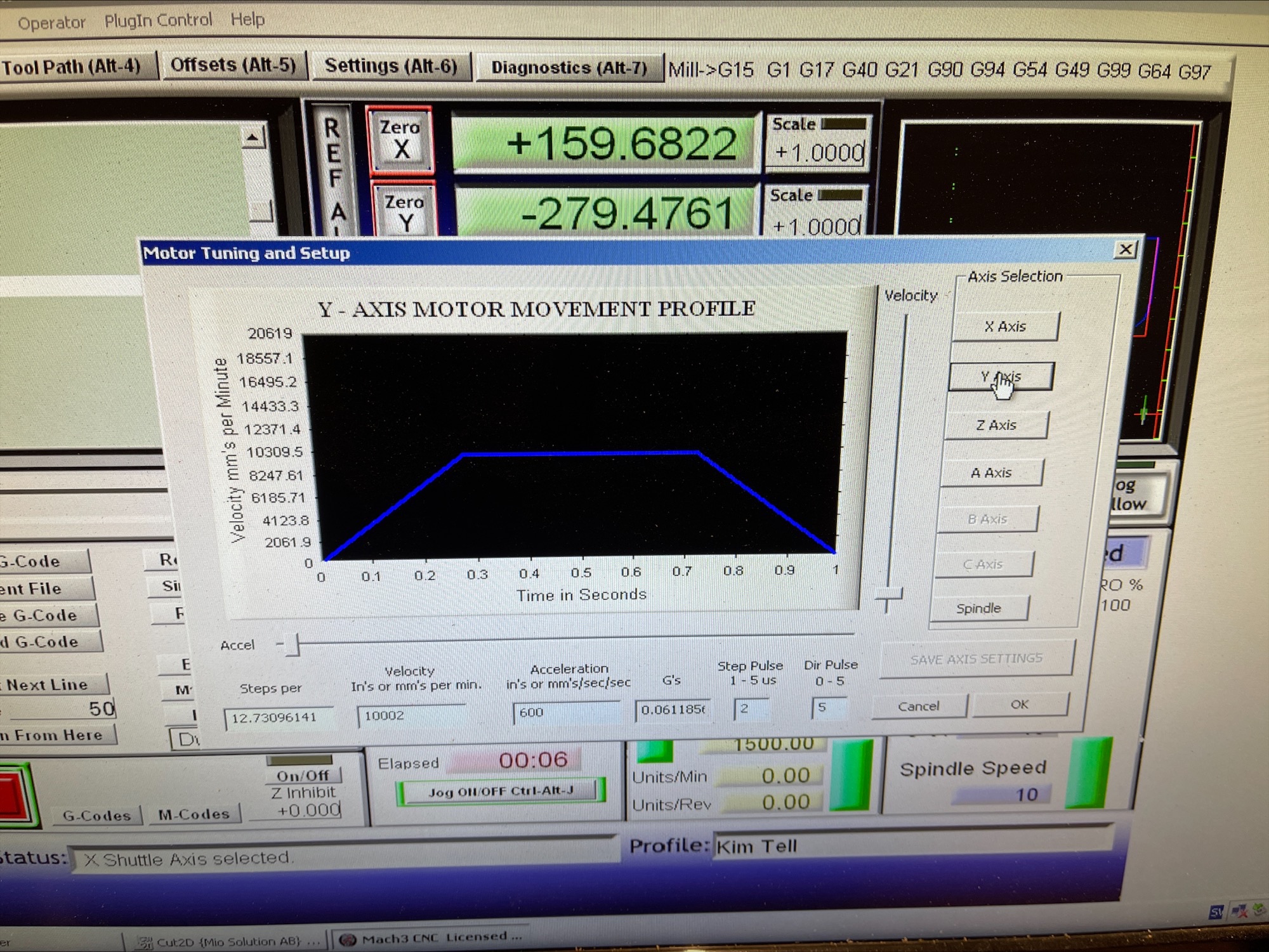I have auto set step in mach3 to correct mm but please if anyone know if i have som setup wrong i dont actually knows what like step pulse, dir pulse and if velocity and accelerations should be set to. Same in general config. The owner of the machine is not alive and Marchand Dice is gone so i dont have anyone to ask what to set everything to. IJ Mode seems to change to Inc from absolute when restart mach3, dont know why but that i can live with.