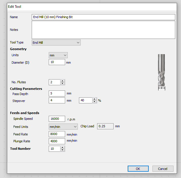 Chip Load = Feed Rate (millimetres per minute) / (RPM x number of flutes)