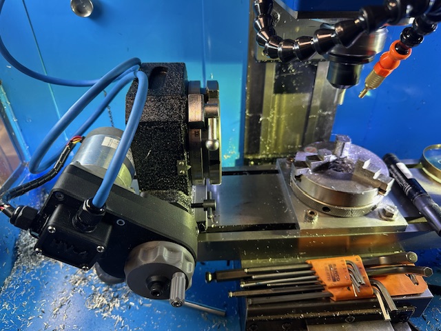 One last thing on my list was converting an RDG Tools HV4 rotary table to a 4th axis. I recycled the stepper motor that originally drove the tool carousel to power the 4th axis. I had already installed a socket and stepper drive for this purpose. A word of warning: if you’re considering buying an RDG Tools HV4 or similar £100 rotary table, DON’T—they’re rubbish! I wasn’t expecting much, but it was about 50% worse than I anticipated. Apparently, Vertex Taiwanese HV4 tables are far superior to the poor-quality Chinese ones sold by RDG Tools. The main issues with the HV4 I used were significant. The 3 Morse taper bore was a good fit on a Morse taper sleeve but was nearly 0.5mm out of true—yes, half a millimetre! Additionally, every single part had burrs and work-holding damage from chuck jaws, etc. I couldn’t be bothered to send it back, and honestly, I enjoy tackling a basket case! So, I re-machined nearly everything the manufacturer had messed up, spent time deburring, and ensured the worm gear was mounted accurately. With some care and running in, I managed to get it running mostly true with minimal backlash. I designed a 3D-printed belt housing and motor mount. The main motor mount was commercially 3D-printed in nylon, while I printed the other parts in ABS. Unfortunately, I didn’t take many pictures during the build, but here are a few of the finished unit.
