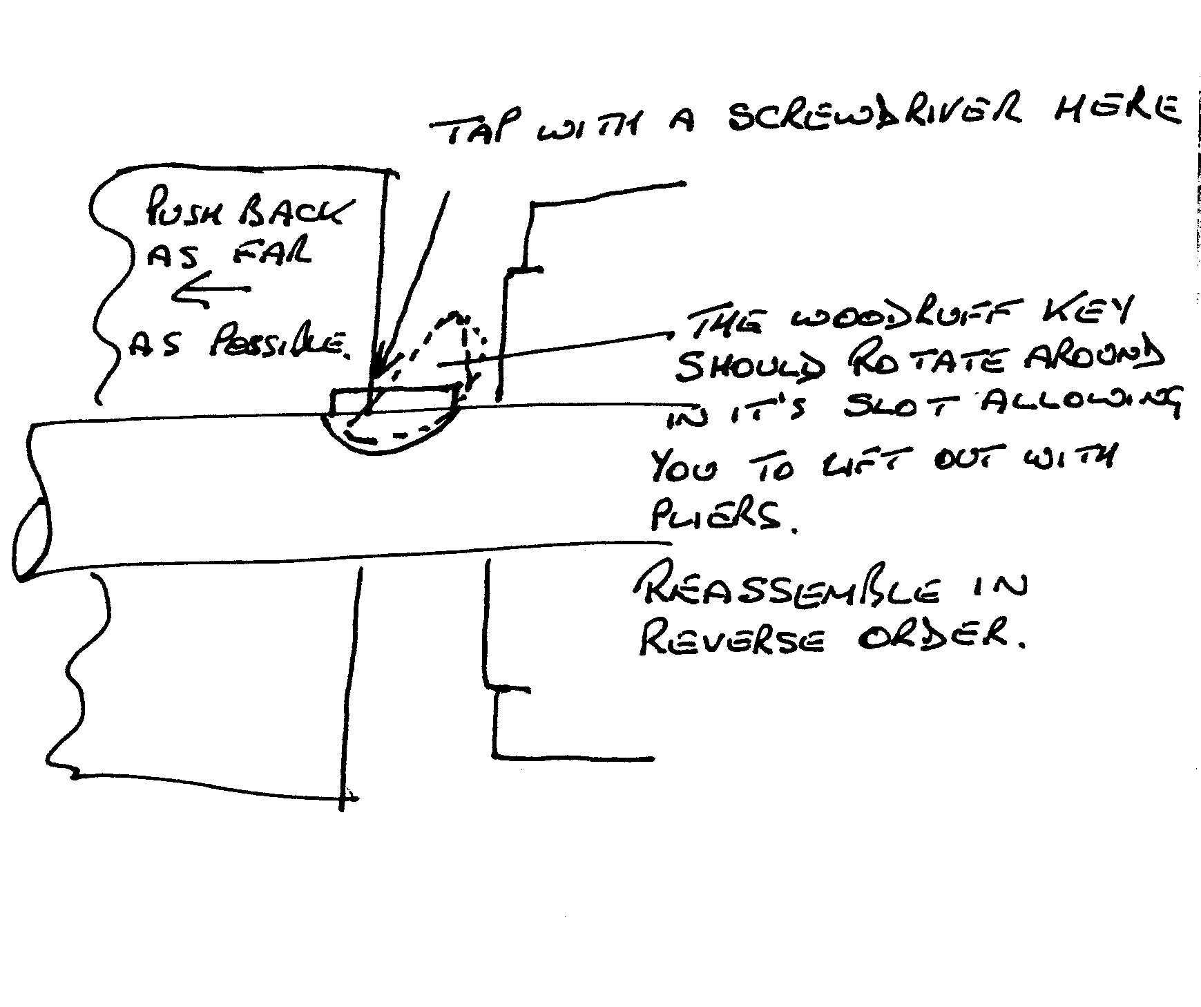 Then a slight tap on the top of the key in the position shown on the sketch should rotate the key in it's half round slot. As long as where you hit is further back than the centre position of the key, this should work.