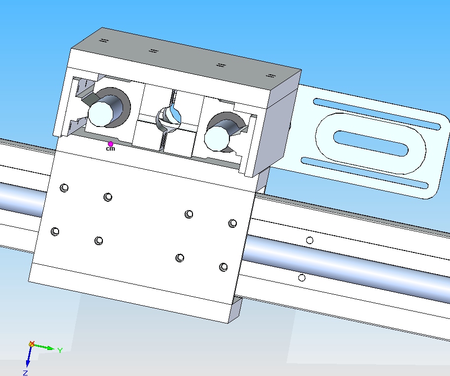 Here's my current design. Just trying to work out how to fix the 4 blocks to the aluminium plate that slides on the Y axis. There's not much room and it's made more difficult because the bolts thread into the bearing blocks...I don't really want to start drilling those out.