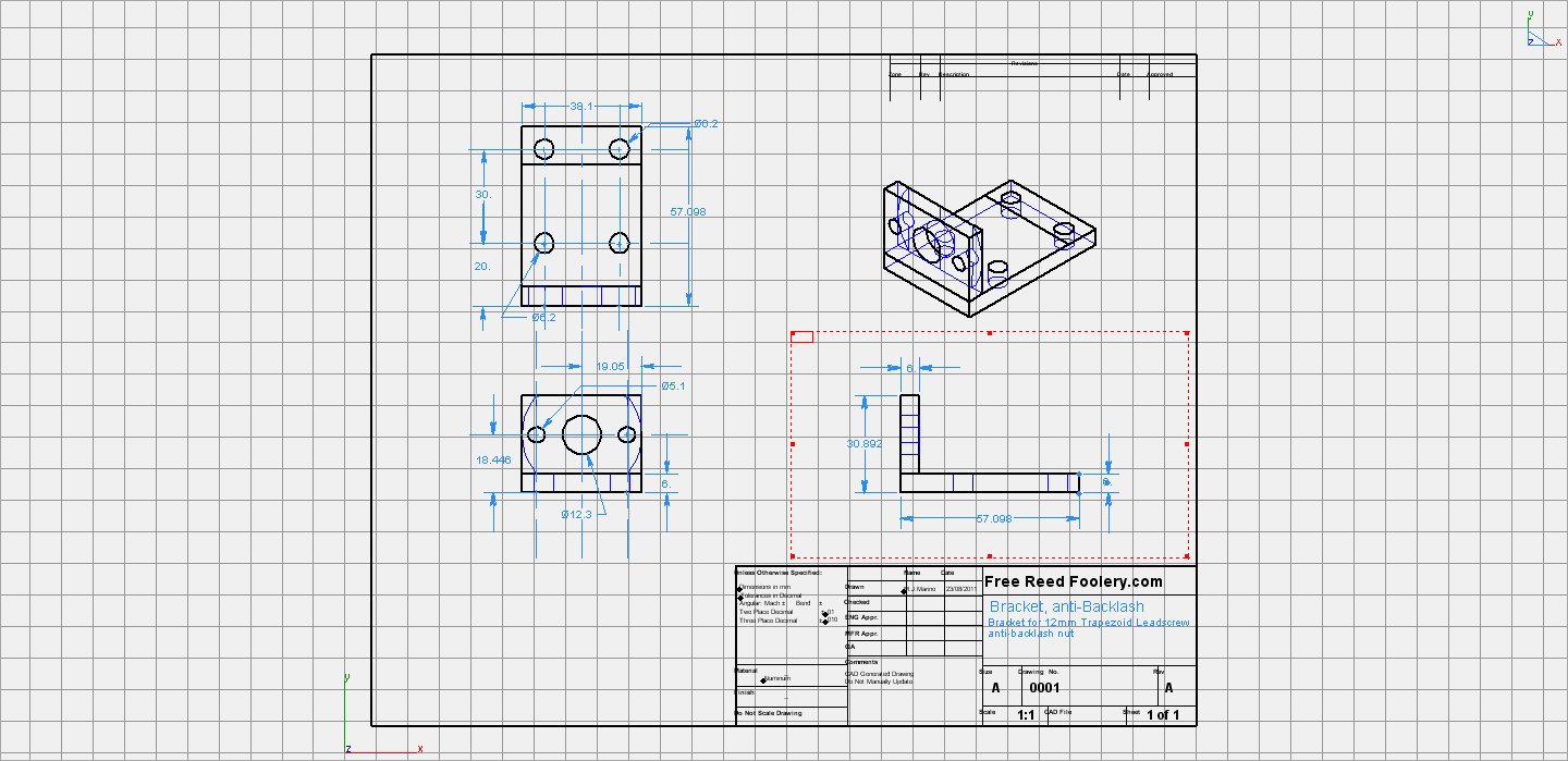 Sorry that they are jpeg's as it would not let me load the .dwg or .iges file format. That is the bracket I designed to go with a dumpsterCNC anti backlash nut for a 12mm trapezoid leadscrew. Clearance is only 40mm in height. Any opinions???