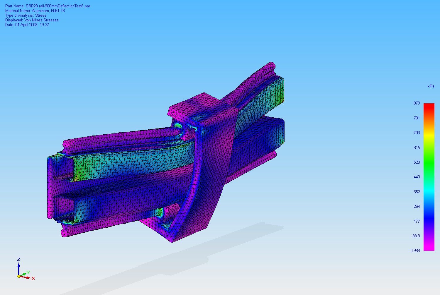 Sorry I should have been clearer, I meant the accuracy of the straightness of the rail, not the tolerances they are machined to. Obviously I agree that overall profile rails are machined to much better tolerances and thus by far the most accurate rails. Round rail bearing blocks and supports are merely extruded.Sloppy - i.e. clearance not preload which is exactly why I'm replacing mine. Simulation of a realistic gantry, same as in first post except both rails and 10mm aluminium plate stuck on the back, forces in X and Z and constrained at the ends: