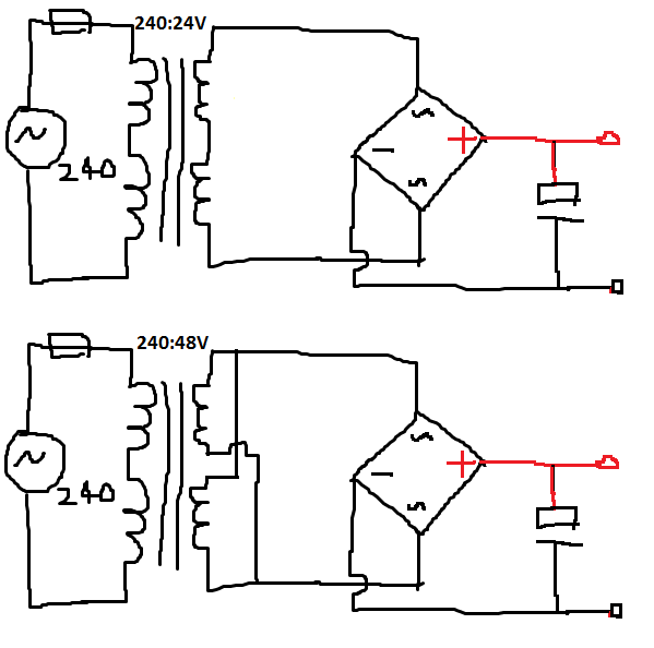 Think I should say that if you choose the top pic Jonathan drew you will be getting double the voltage of the 2 secondery ouput ratings IE: 2x24=48V but only half the rated Amps of both seconderys but if you wire have 48V seconderys and wire parallel you get the same 48V but double the amps.